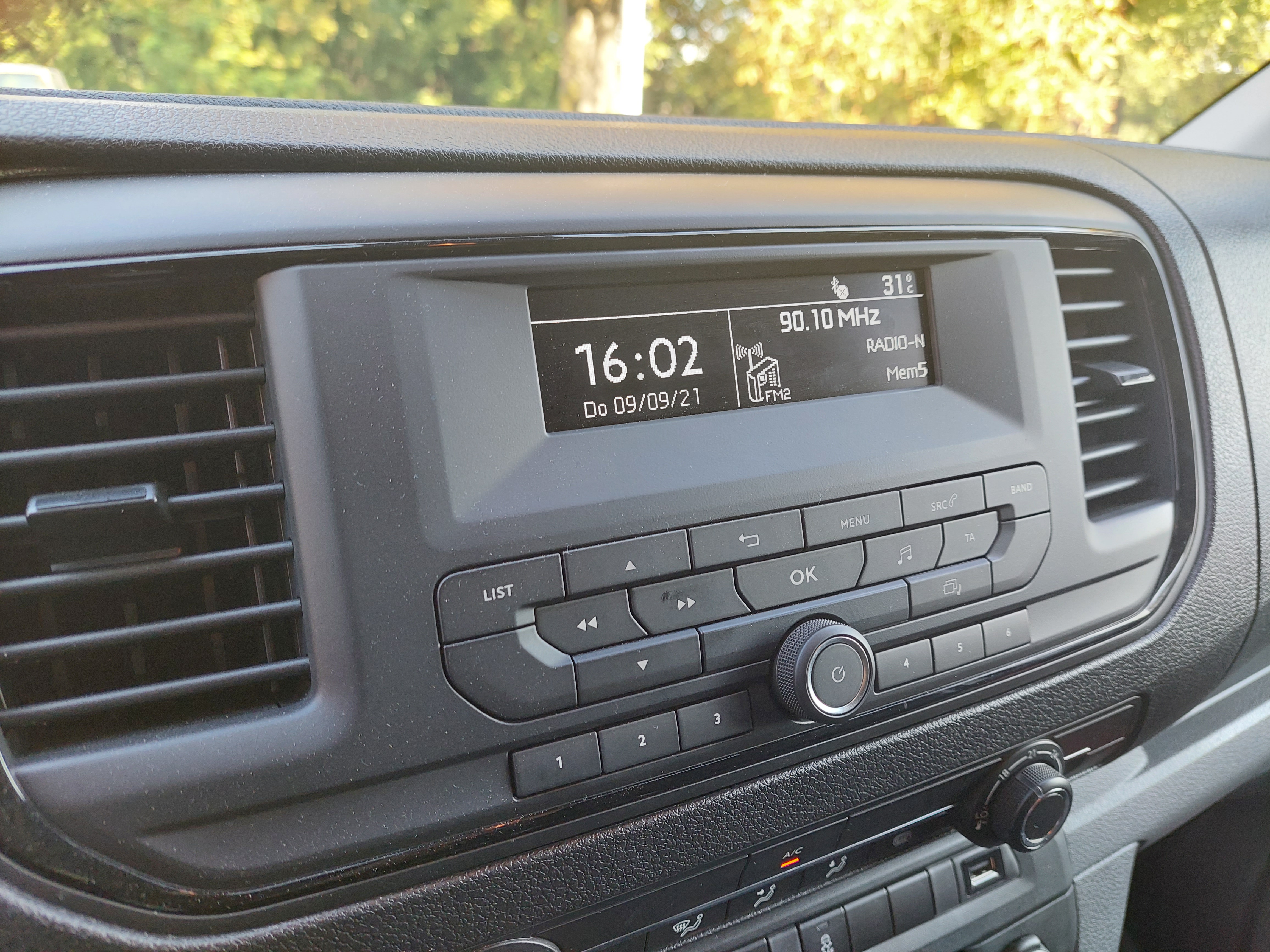 Etwas uninspriert fanden wir die Gestaltung des Arbeitsplatzes für Fahrer und Beifahrer. Ein wilder Stilmix aus analogen Instrumenten und Drehschalter für Klima, modernen Designschaltern für Fahrmodi-Auswahl und Gangwahl und einem heillos veralteten Radio. Jetzt wäre das grundsätzlich für ein Nutzfahrzeug mehr als genug, trotzdem haben wir 2021 und da wäre in diesem 5-Meter Schiff mit modernstem Antrieb eine Rückfahrkamera samt kleinem Infotainment doch sehr wünschenswert. Noch dazu haben wir uns von der Ausstattung "Premium", dann doch etwas mehr erwartet als wir bekommen haben. Bei aller Fairness seit erwähnt, dass es Infotainment usw.. sehr wohl für den e-Expert gibt. Warum aber genau die "Premium"-Ausstattung dann nicht damit ausgestattet ist, entzog sich dann doch unserem Verständnis. Zwei Personen haben im Cockpit problemlos Platz, der mittlere Sitz ist aber nur sehr zierlichen Personen empfohlen, da die Konsole für Gangwahl und Fahrmoduswahl sehr weit in den Sitz ragt und das Knie malträtiert.