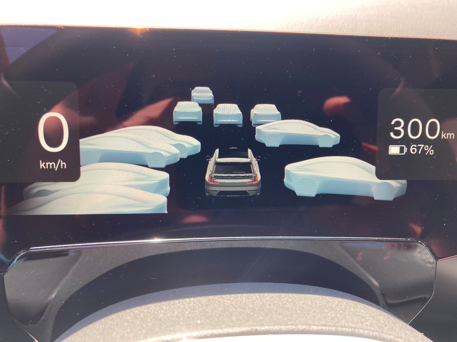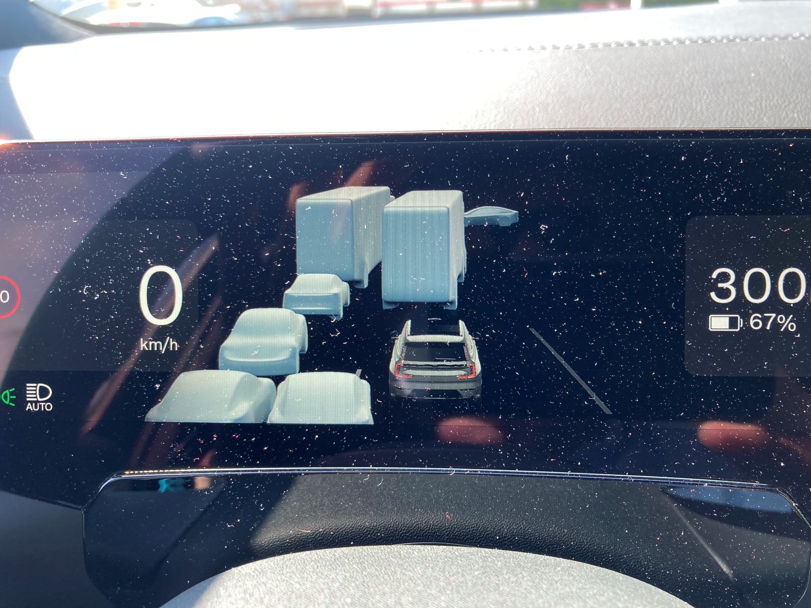 Er wäre kein Volvo, der EX90, wenn er nicht irgendetwas Neuartiges verbaut hätte, das die Sicherheit verbessern soll. In diesem Fall ist es Lidar. Nein keine Figur aus Pipi Langstrumpf, sondern quasi ein Sicherheitsauge. Diese befindet sich oberhalb der Windschutzscheibe und sieht aus wie ein zu kleine geratenes Taxischild. Dahinter versteckt sich eben unter anderem die zukünftige Technik für autonomes Fahren. Insgesamt ein sehr fortschrittliches System, das beispielsweise alle Autos im Umkreis von zig Metern erkennt und dazu noch in Millisekunden die Größe der anderen Fahrzeuge im Blick hat. Am Screen vor dem Fahrer kann man sogar eine Animation sehen, wie der Verkehr vor einem gescannt wird. Theoretisch könnte man nur mit dem Animationsbildschirm fahren. Ob ich als Fahrer das beobachten muss, ist natürlich fraglich. Es zeigt aber wie das System arbeitet. Und natürlich ist dieser Luxus-Volvo mit zahlreichen zusätzlichen Assistenten vollgestopft. Alleine darüber könnten wir Seiten füllen!