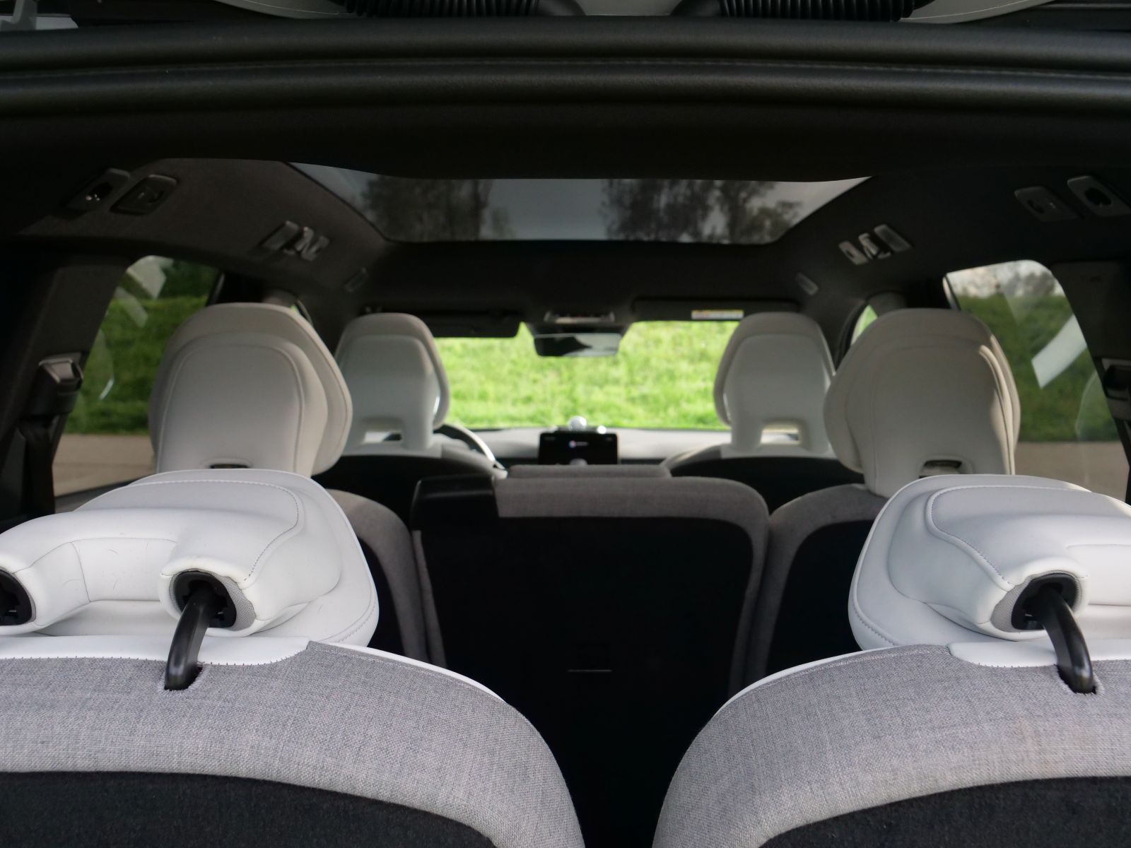 Das Testauto war als Siebensitzer ausgelegt. Wie immer sind die Platzverhältnisse in der dritten Reihe beengt. Das ist aber in der Regel bei allen SUVs, die als Siebensitzer erhältlich sind so. Die Dritte Reihe lässt sich auf Knopfdruck umlegen. Dabei verschwinden die Sitze praktisch im Kofferraumboden. Insgesamt verdient der Kofferraum die Bezeichnung Schlund. Da passt wirklich sehr viel rein. Auch bei Verwendung der dritten Sitzreihe bleiben 324 Liter Kofferraumvolumen übrig. Wenn diese nicht verwendet wird, sind es stolze 700 Liter! Zusätzlich gibt es unter der Motorhaube noch Stauraum für Kabel und andere Utensilien. Das Innendesign ist „typisch Volvo“. Sehr geradlinig, keine Verschnörkelungen, wenig Knöpfe und ein auffälliger Hauptscreen, der vertikal angeordnet ist und damit wie ein übergroßes iPad aussieht. Als Fahrzeugschlüssel dient das Handy oder alternativ eine Karte. Letztere hatten wir im Test. Die ist aber eher umständlich, weil man diese direkt an den Türgriff halten muss, damit der Volvo öffnet. Zudem muss die Karte auf ein eigenes Plätzchen im Bereich der Mittelkonsole gelegt werden. Die Karte kann also nicht einfach in der Hosentasche verschwinden.