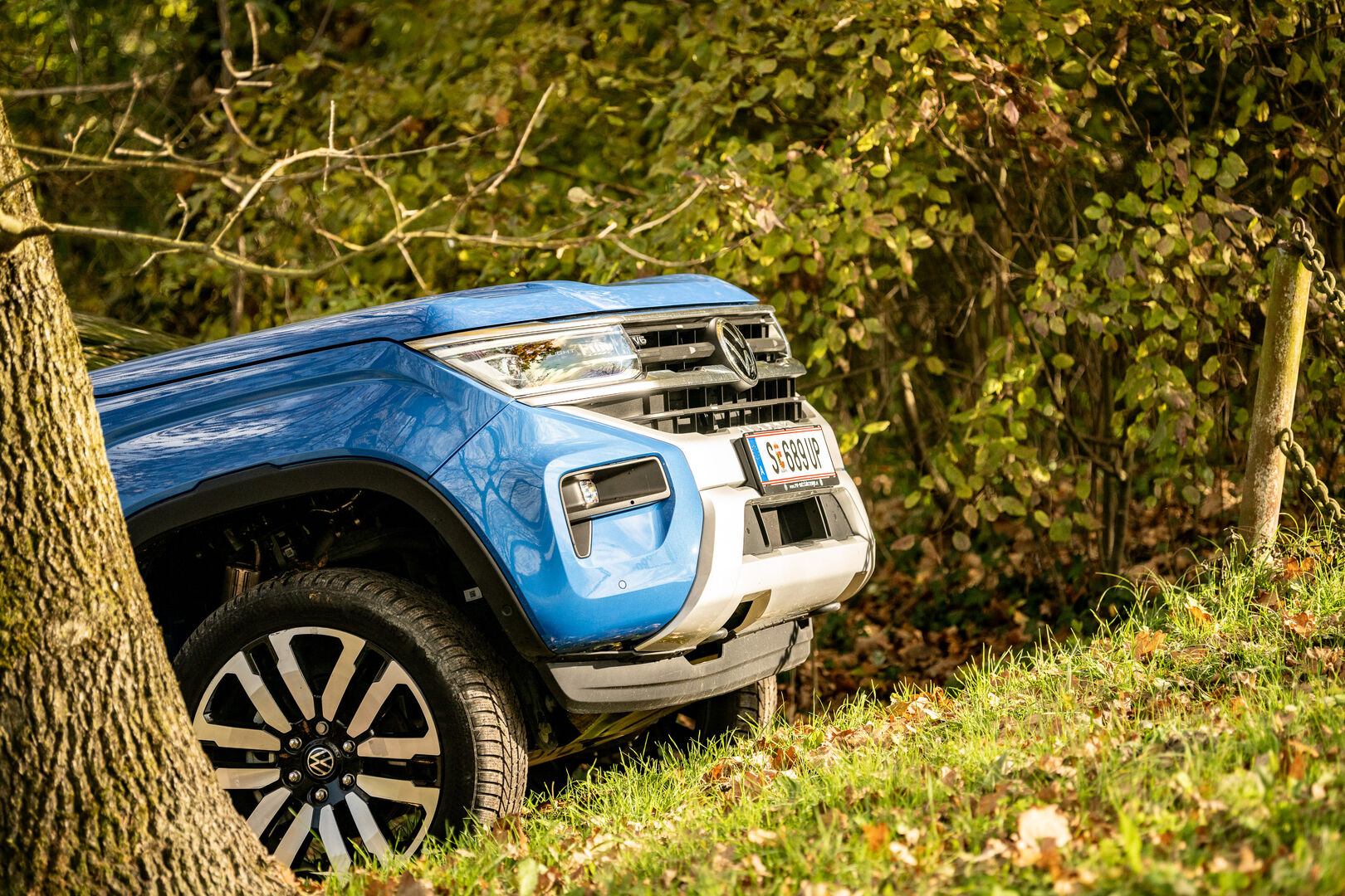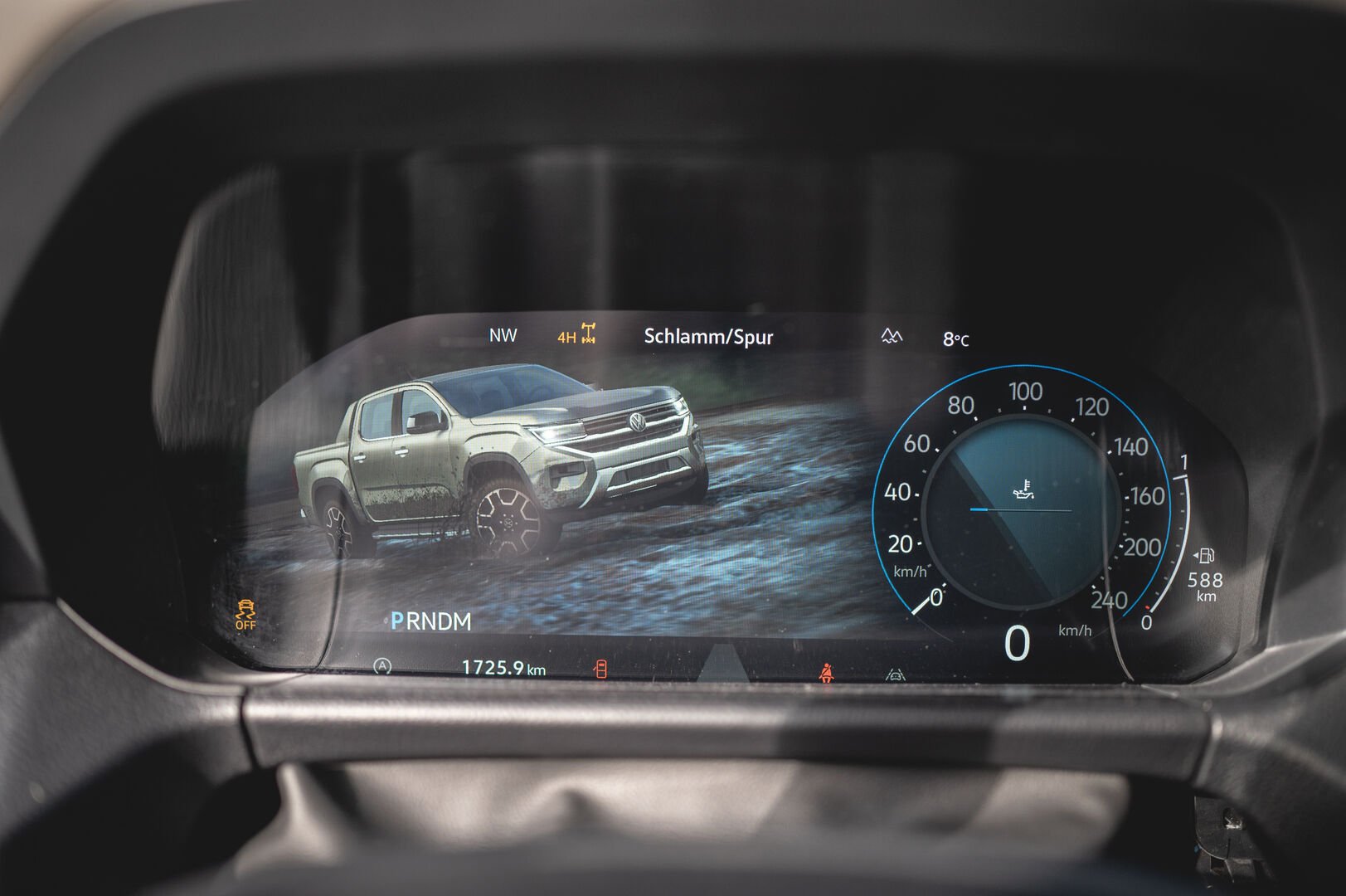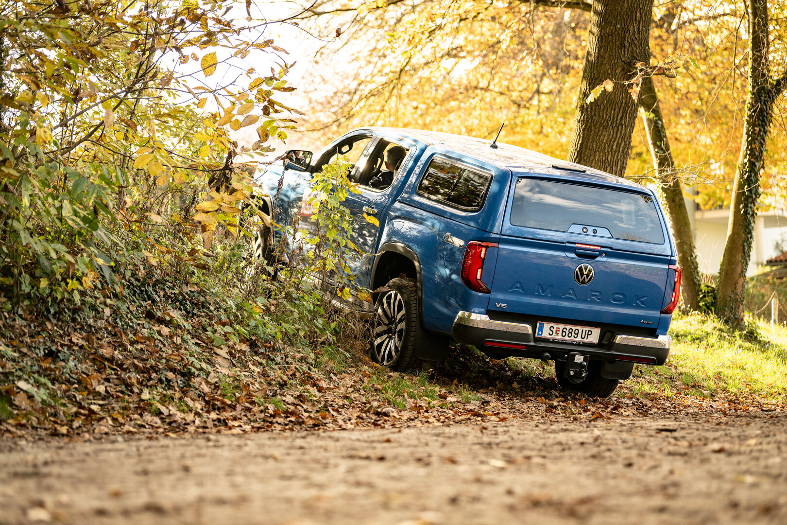 Beim Verbrauch liegt der Amarok laut WLTP kombiniert bei 8,6 bis 10,2 Liter, im Test schafften wir bei braver Fahrweise gut 9,4 Liter. Wer bleifußartig in der Stadt fährt, kommt leicht auf 12 Liter – der Amarok ist eben kein Kleinwagen, sondern eine gewichtige Erscheinung. Verglichen mit dem Vorgänger ist er sogar um 10 Zentimeter gewachsen. Und wie macht er sich als Zugpferd? Nun, alle Modelle haben Allrad. Je nach Getriebe ist dieser unterschiedlich zuschaltbar – also 2H, 4H und 4L oder 4A, 2H, 4H sowie 4L. Eine Differenzialsperre ist ebenfalls vorhanden. Wer will, kann sogar Flüsschen durchqueren, denn 80 Zentimeter Watttiefe stehen bereit.