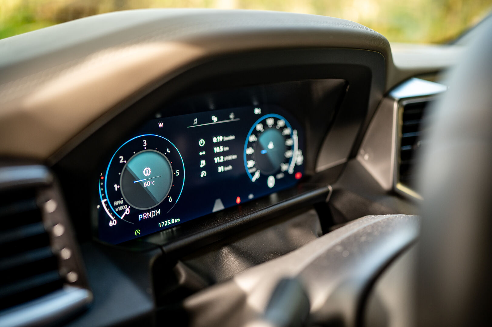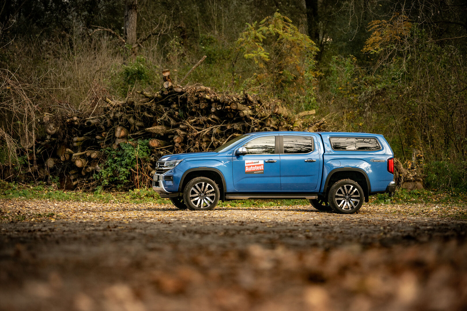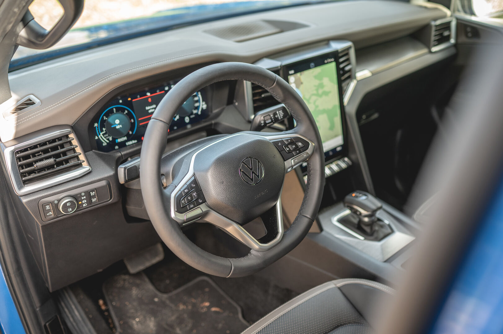 Beim Verbrauch liegt der Amarok laut WLTP kombiniert bei 8,6 bis 10,2 Liter, im Test schafften wir bei braver Fahrweise gut 9,4 Liter. Wer bleifußartig in der Stadt fährt, kommt leicht auf 12 Liter – der Amarok ist eben kein Kleinwagen, sondern eine gewichtige Erscheinung. Verglichen mit dem Vorgänger ist er sogar um 10 Zentimeter gewachsen. Und wie macht er sich als Zugpferd? Nun, alle Modelle haben Allrad. Je nach Getriebe ist dieser unterschiedlich zuschaltbar – also 2H, 4H und 4L oder 4A, 2H, 4H sowie 4L. Eine Differenzialsperre ist ebenfalls vorhanden. Wer will, kann sogar Flüsschen durchqueren, denn 80 Zentimeter Watttiefe stehen bereit.