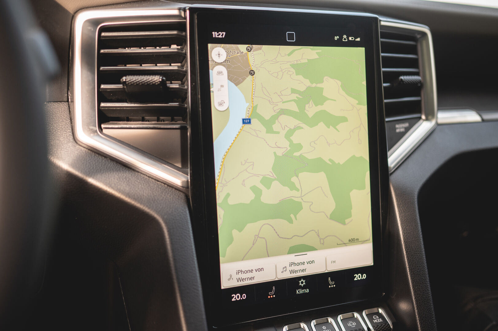 Wie alle Pick-ups dieser Welt sind der Komfort-Federung Grenzen gesetzt, schließlich muss diese auch schwere Lasten verdauen. Generell hat VW die Fahrwerksabstimmung super hinbekommen. Im Alltag fährt sich der große Amarok überraschend komfortabel und unproblematisch, solange man nicht mit 100 Sachen auf Serpentinenjagd geht – aber wer will das schon? Nebenbei bemerkt: Der neue Amarok wird gemeinsam mit Ford gebaut. Rein optisch betrachtet gehen Ford Ranger und VW Amarok sehr unterschiedliche Wege. Das gilt auch für den Innenraum. Bis auf den riesigen horizontal angeordneten Screen gibt es kaum offensichtliche Gemeinsamkeiten. Dieser leistet gute Dienste als Rückfahrkamera, da die Anhängekupplung am Screen gut zu sehen ist.