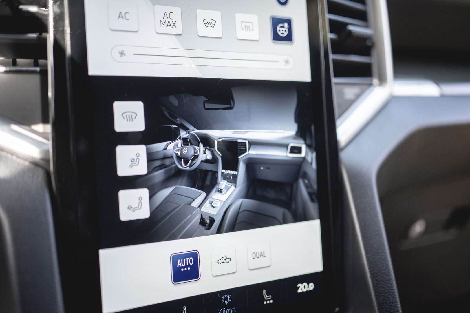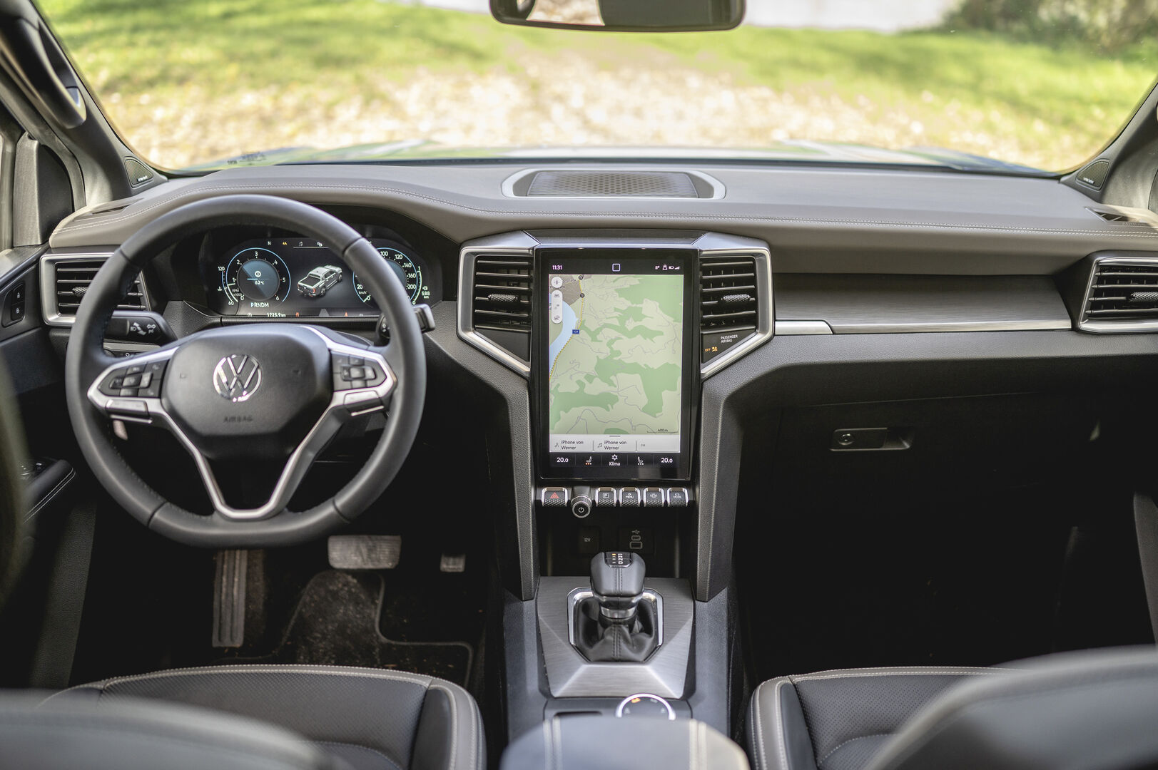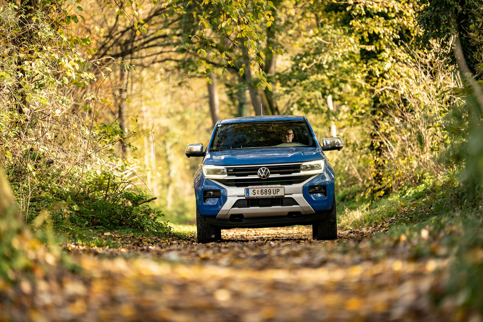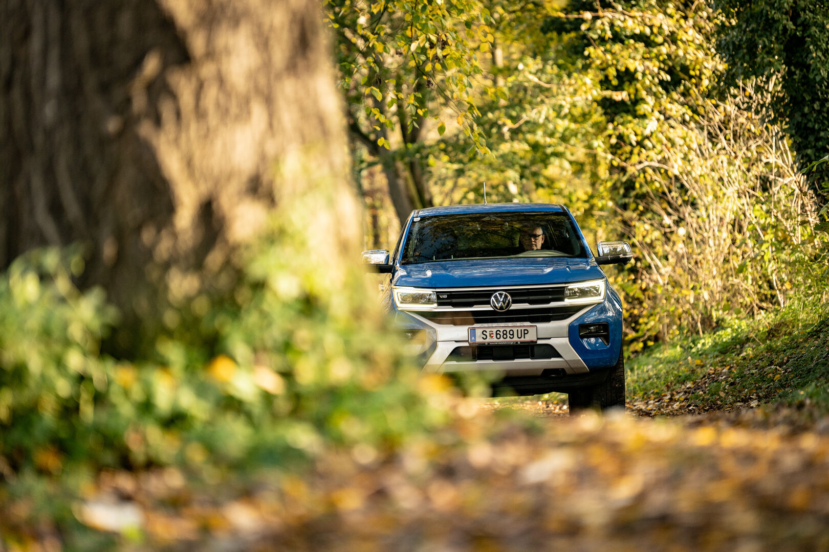 Wer möchte, kann den neuen Amarok über Stock und Stein prügeln oder mit Letzterem kräftig beladen. Der Pick-up sieht vielleicht nicht so aus, versteckt aber hinter der coolen Fassade ein echtes Nutztier. Dank fetter Bodenfreiheit und im Testauto verbauter Geländeuntersetzung sowie Allrad und kräftigen 240 PS lässt sich auch bei widrigen Verhältnissen viel Ladegut flott bewegen. 3,5 Tonnen maximale Anhängelast und eine Zuladung von bis zu 1,19 Tonnen sind möglich. Das Wort „Nutztier“ ist im Grunde nicht treffend: Im Innenraum gibt es viel Komfort. Auffallend ist der extrem große 12,3-Zoll-Screen im Bereich der Mittelkonsole. Derartiges ist selbst im Pkw-Bereich eine Seltenheit. Die Menüführung wirkt logisch und man vergaloppiert sich nicht in Schnickschnack-Untermenüs. Wer schlaglochverseuchte Wege nimmt, tut sich jedoch schwer, den richtigen „Touch“ zu finden. Ja, altmodische Knopferl haben auch Vorteile.