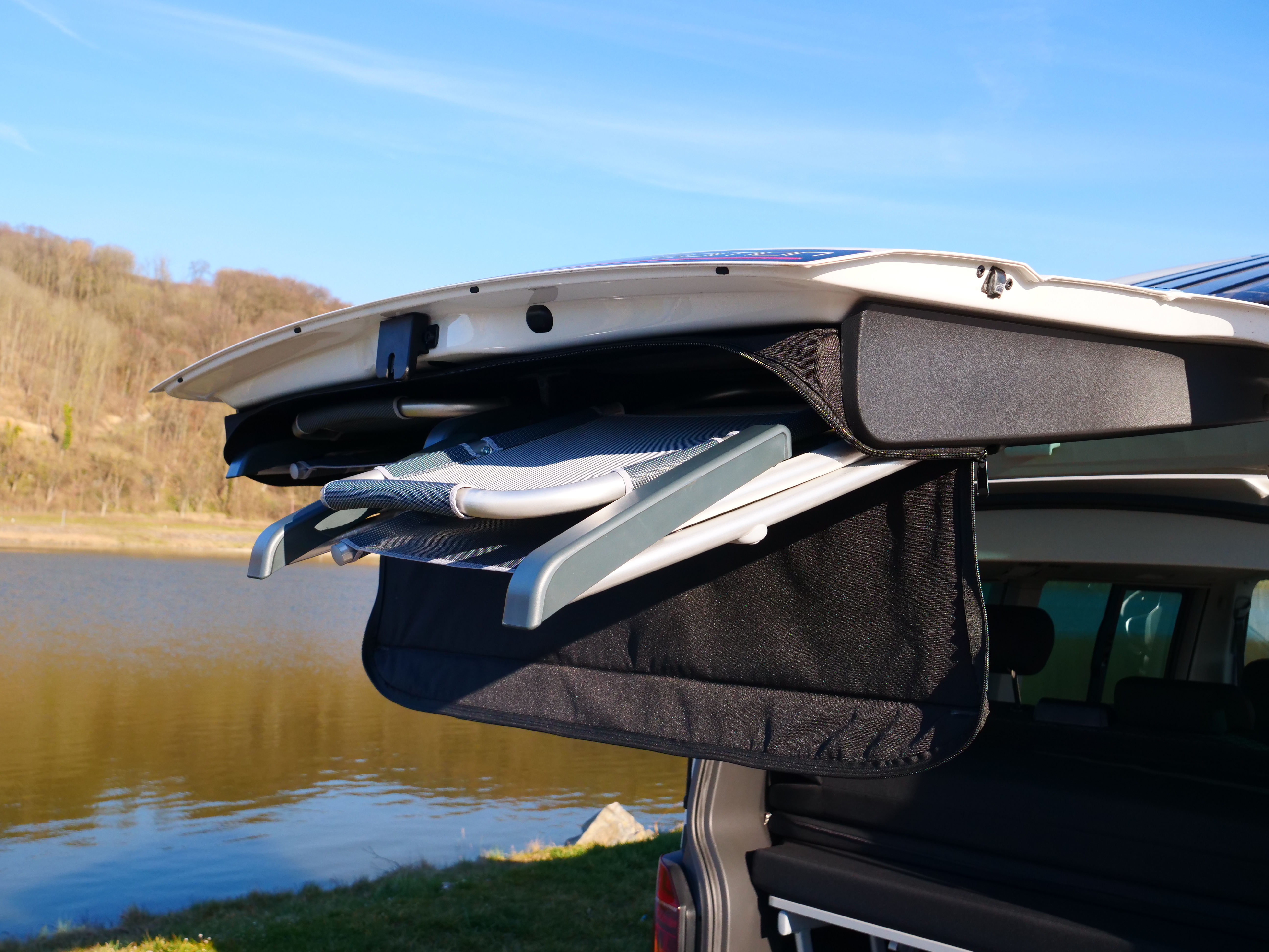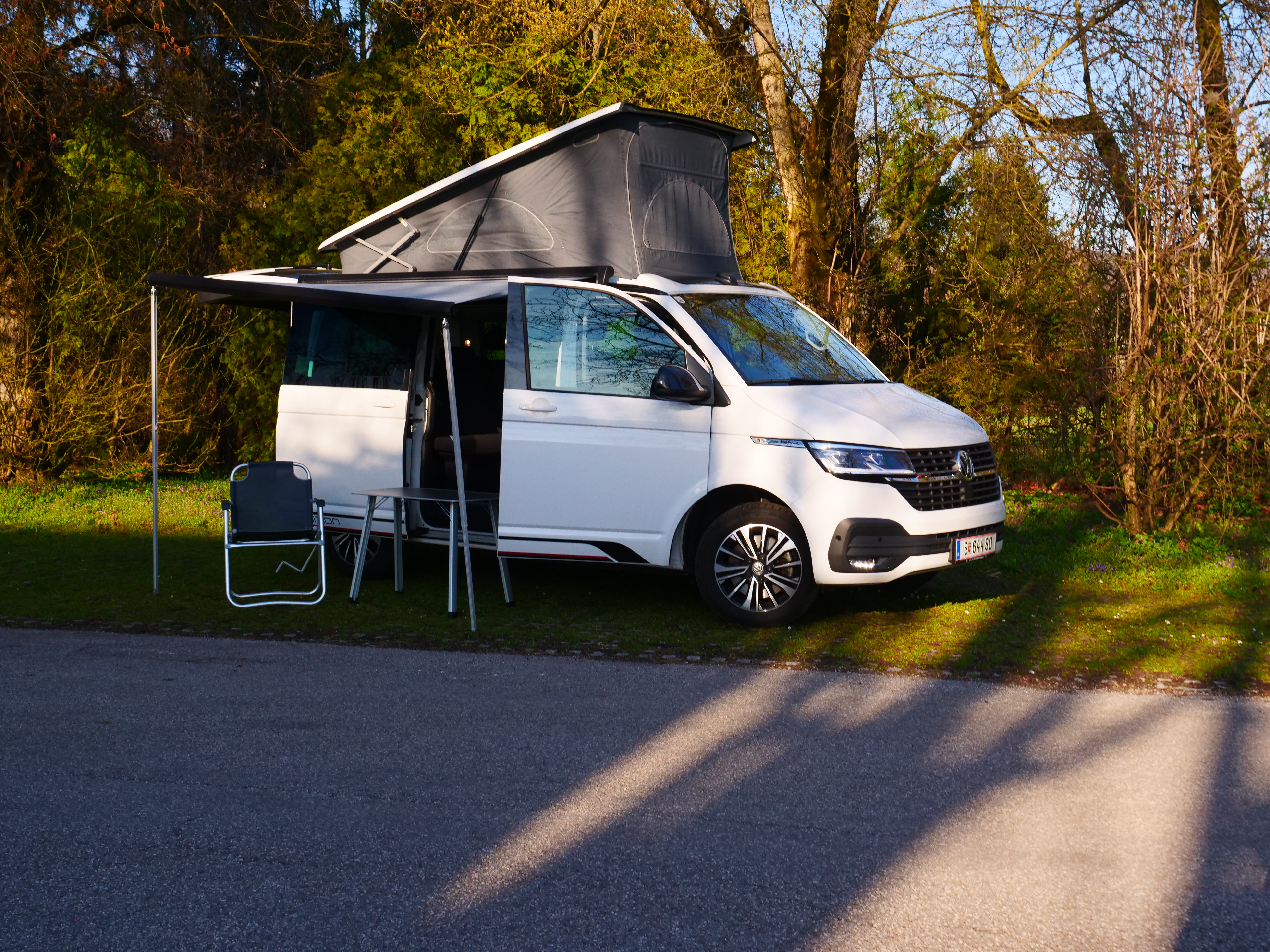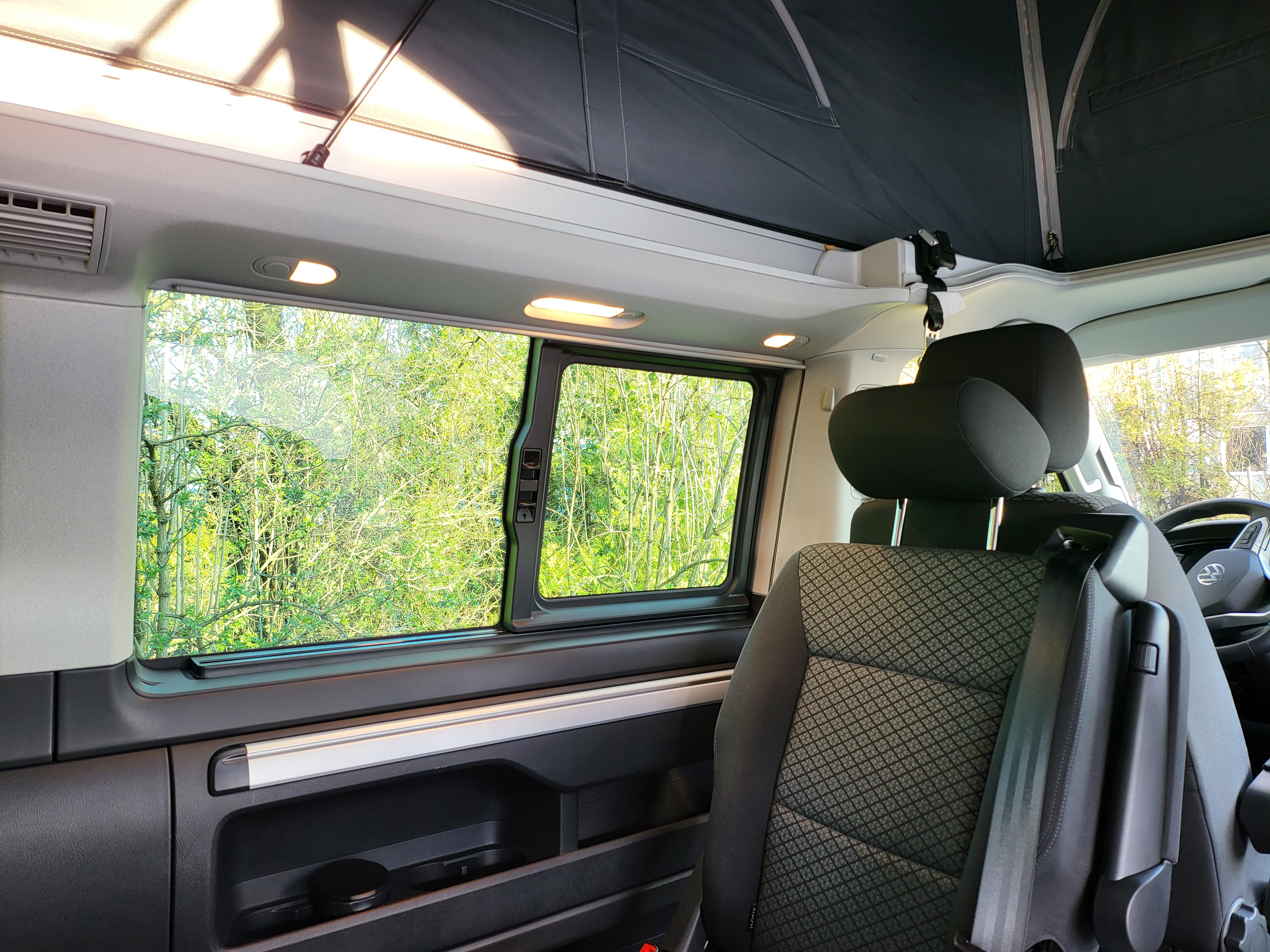 Auf den ersten Blick sieht es im Innenraum gar nicht so sehr nach Wohnmobil aus. Eher wie in einem Multivan. Das hängt damit zusammen, dass im Test-VW keine Küchenzeile verbaut ist. Auf den zweiten Blick gibt es aber eine Menge cooler Campingfeatures. Da hat sich VW einiges einfallen lassen. So versteckt sich in der Schiebetüre ein wirklich solider Campingtisch. In der Heckklappe sind zwei Klappstühle versteckt. Die Rückbank verwandelt sich mit einigen Handgriffen in ein Bett, in dem auch großgewachsenen Zeitgenossen Platz finden. Die Matratzenauflage liegen schon im Kofferraum. Zusatzbatterie, 220 Volt Steckdosen sind vorhanden und in den Seitenscheiben sind getönte Schiebefenster verbaut, die noch dazu mit Rollos verdunkelt werden können. Leselampen und andere Leuchten sind natürlich auch an Bord. Und dann wäre noch das Hubdach…