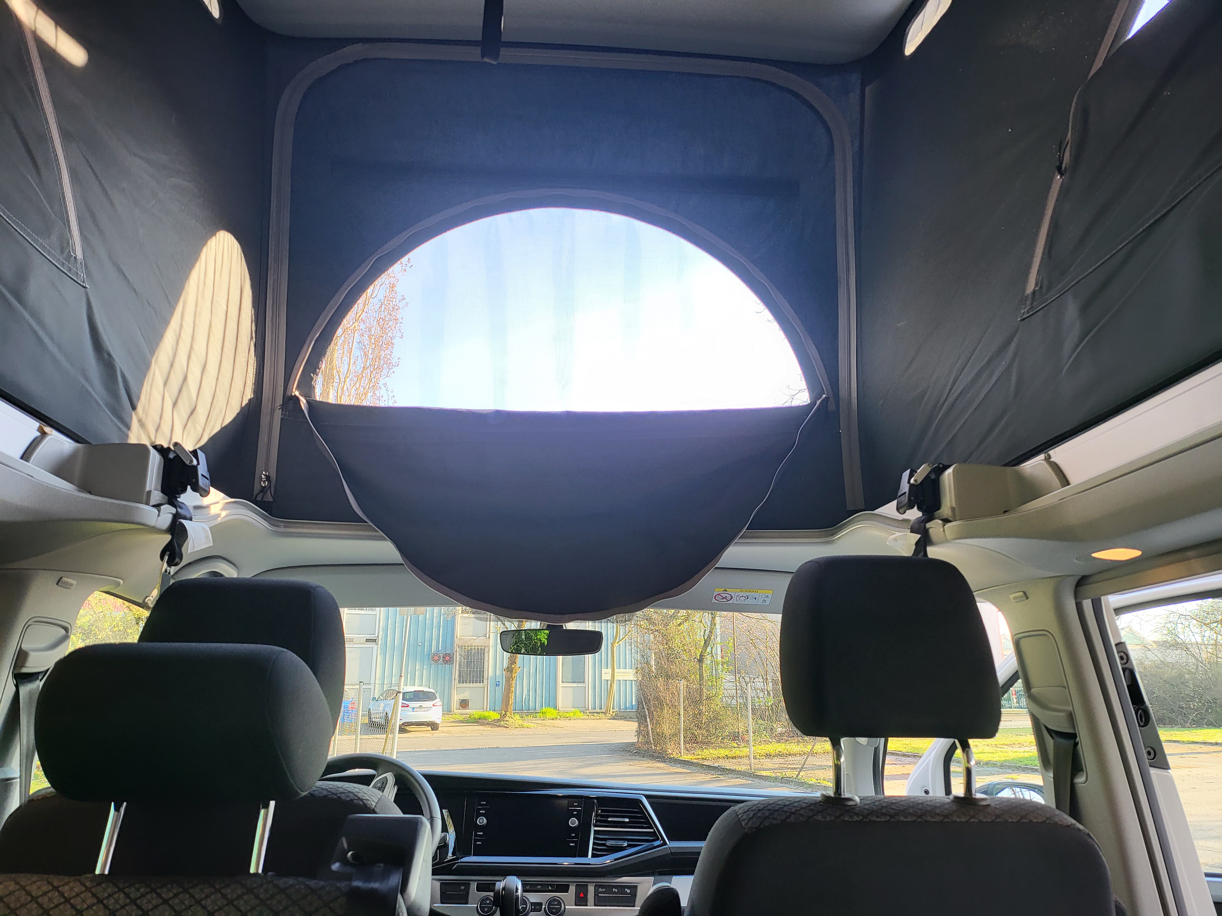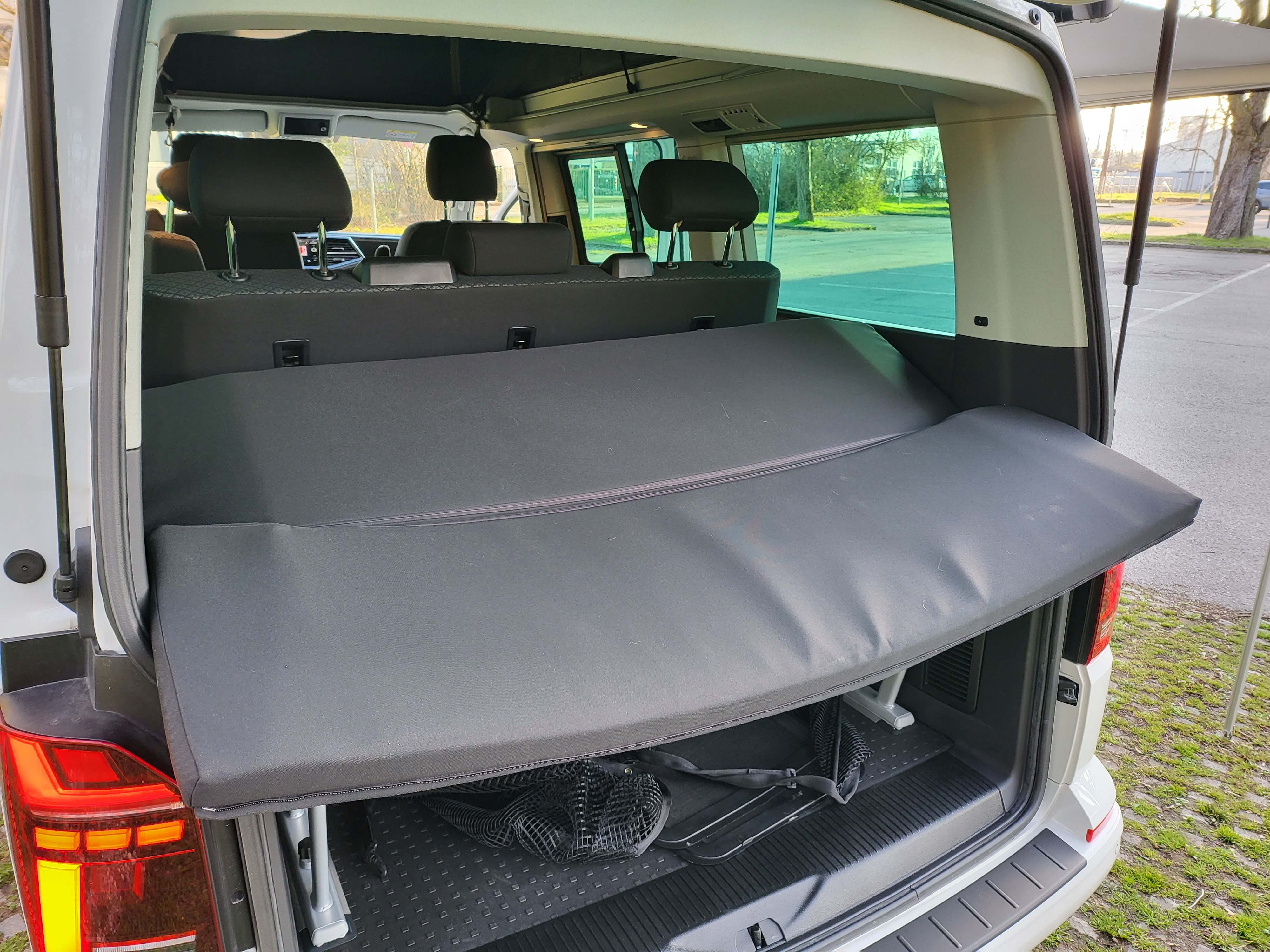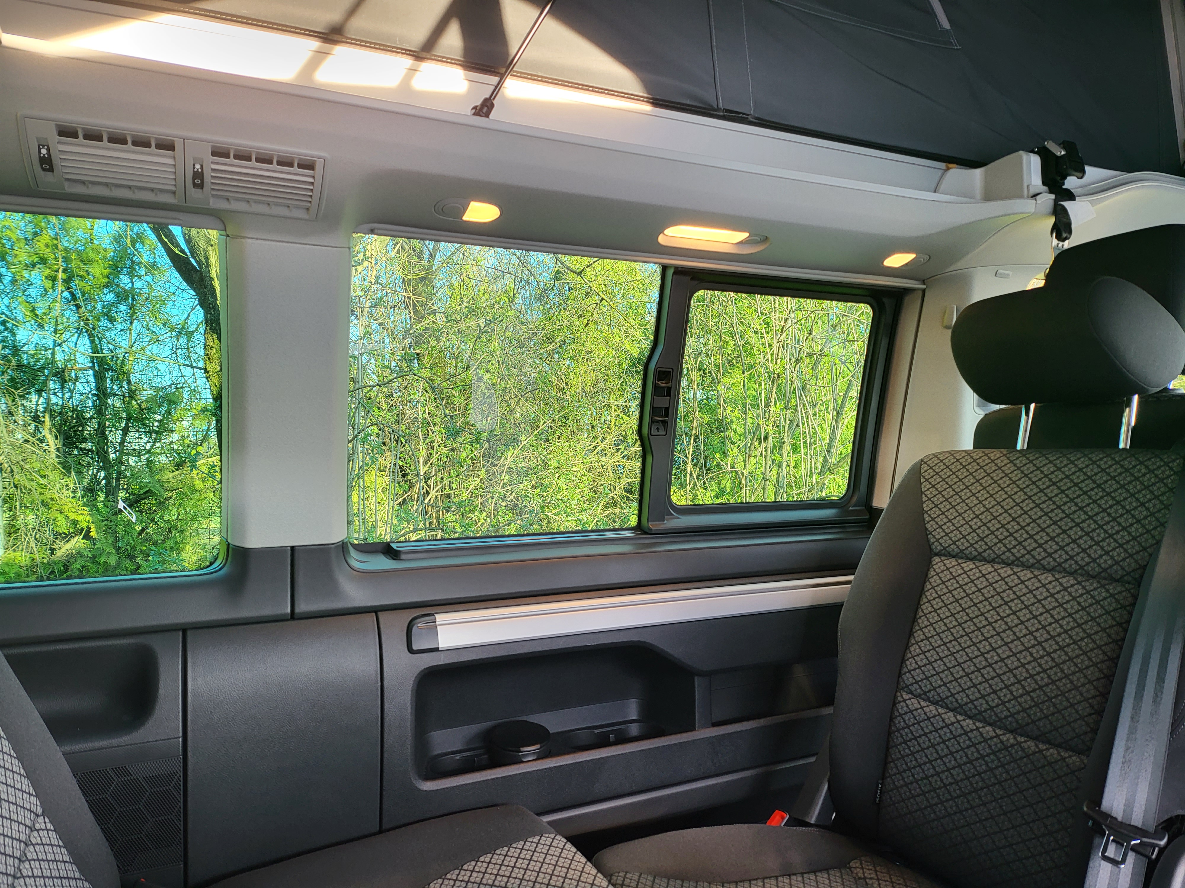 Auf den ersten Blick sieht es im Innenraum gar nicht so sehr nach Wohnmobil aus. Eher wie in einem Multivan. Das hängt damit zusammen, dass im Test-VW keine Küchenzeile verbaut ist. Auf den zweiten Blick gibt es aber eine Menge cooler Campingfeatures. Da hat sich VW einiges einfallen lassen. So versteckt sich in der Schiebetüre ein wirklich solider Campingtisch. In der Heckklappe sind zwei Klappstühle versteckt. Die Rückbank verwandelt sich mit einigen Handgriffen in ein Bett, in dem auch großgewachsenen Zeitgenossen Platz finden. Die Matratzenauflage liegen schon im Kofferraum. Zusatzbatterie, 220 Volt Steckdosen sind vorhanden und in den Seitenscheiben sind getönte Schiebefenster verbaut, die noch dazu mit Rollos verdunkelt werden können. Leselampen und andere Leuchten sind natürlich auch an Bord. Und dann wäre noch das Hubdach…