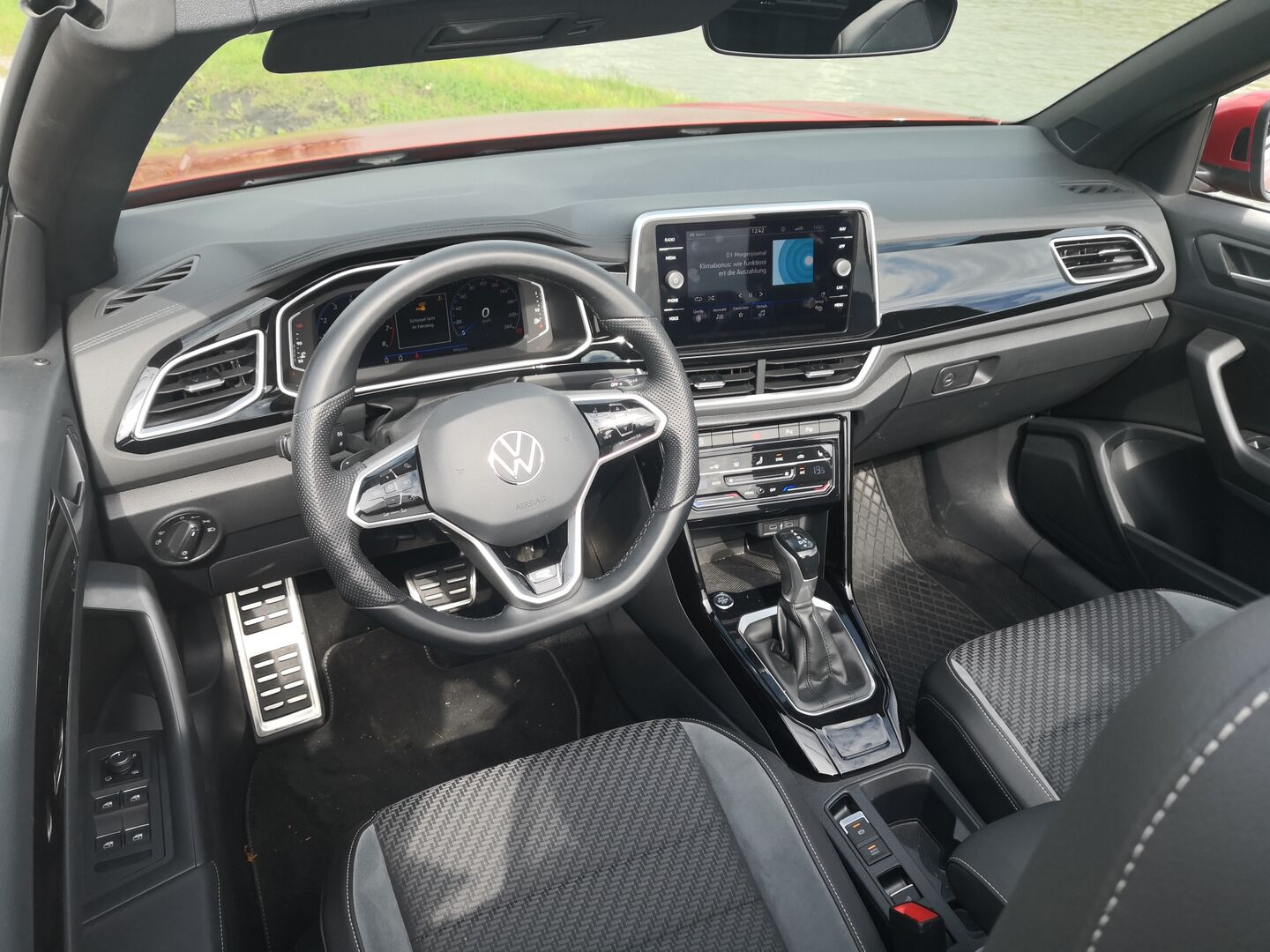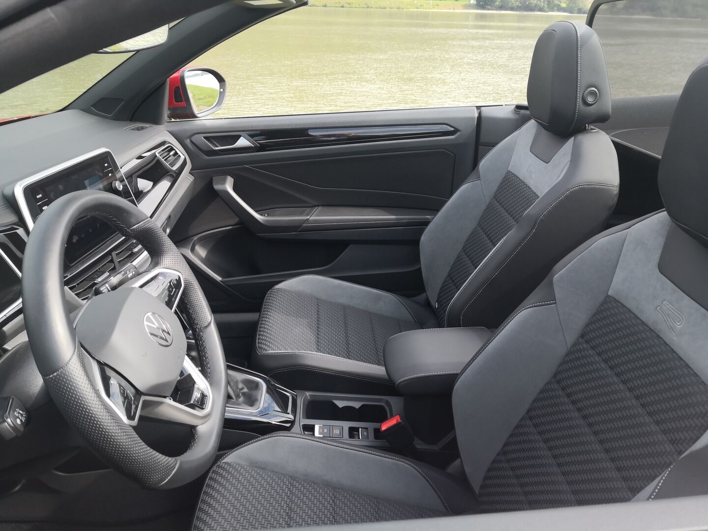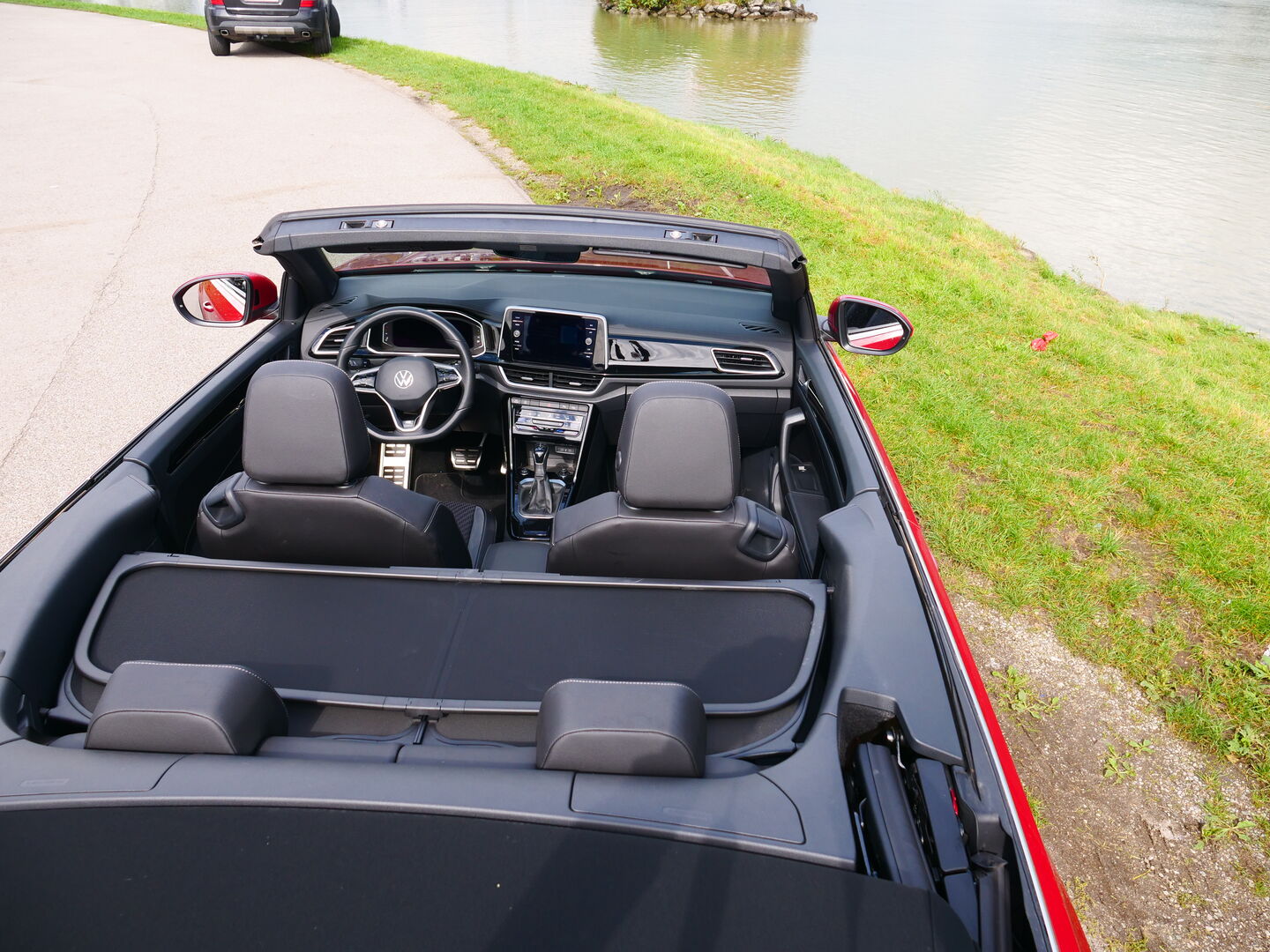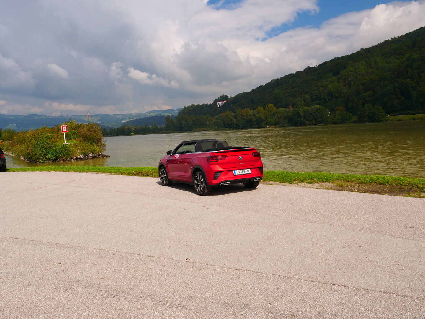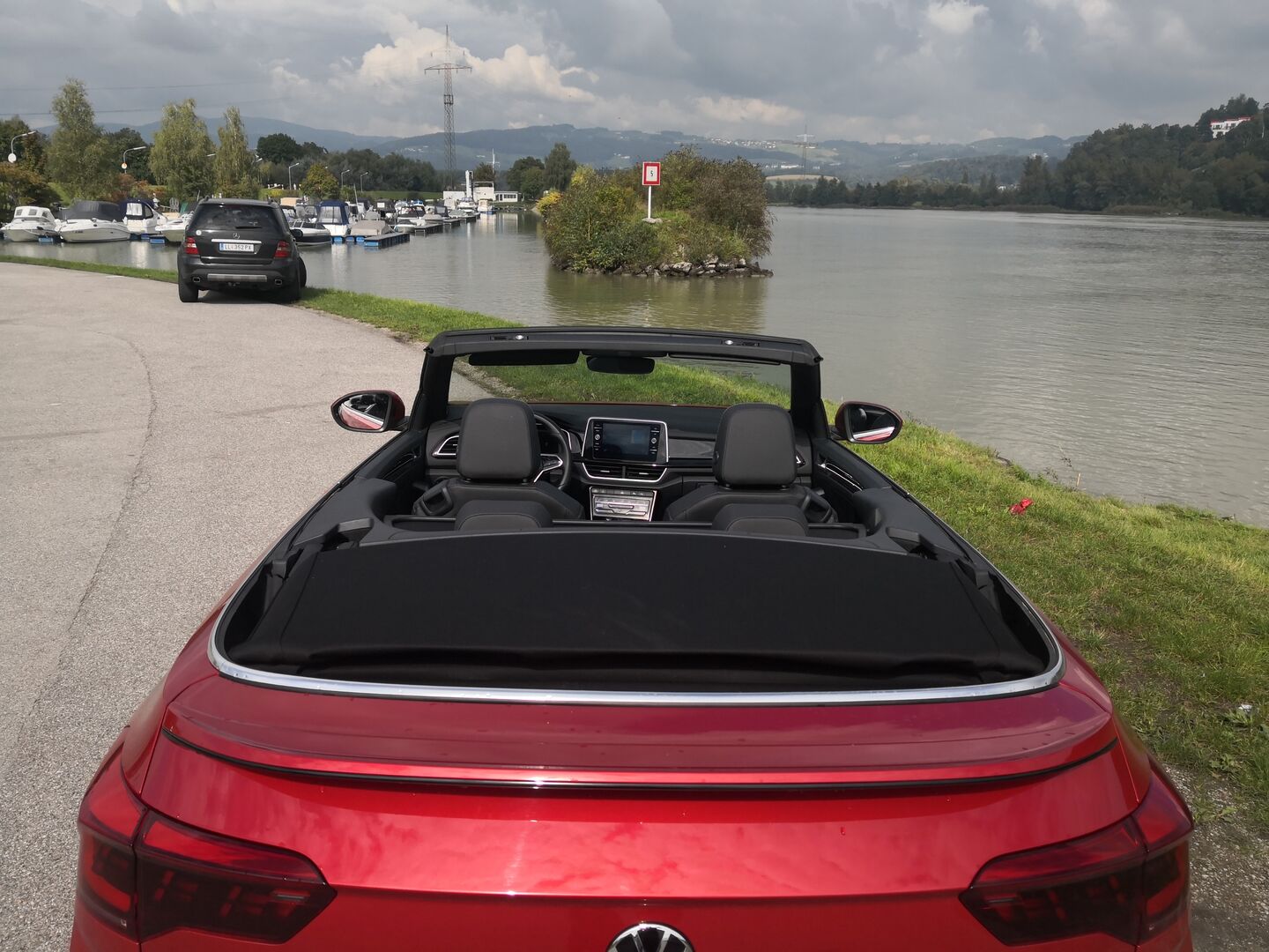 Außentemperatur 13 Grad dazu leichte Bewölkung – optimales Cabriowetter. Also Dach öffnen, was elektrisch in neun Sekunden über die Bühne geht und dies auch während langsamer Fahrt. Ob der doch frischen Temperaturen sicherheitshalber das Windschott aufgestellt und los geht’s. Und siehe da, im Cockpit wird einem nicht die Rübe weggeblasen. Tatsächlich ist es bei eingeschalteter Heizung überhaupt kein Problem ohne Dach über dem Kopf zu fahren. Im Ernst: es gibt wenige Cabrios in denen es auch bei höheren Geschwindigkeiten praktisch windfrei ist. Die 378,- Euro für das Windschott sind jedenfalls gut angelegt. Regenfrei ist der T-Roc jedoch nicht, was wir eine halbe Stunde später bemerkten. Also Dach zu und drauf geachtet, wie schalldicht das Dachl ist. Bewertung: passt gut – man merkt aber doch, dass man in einem Cabrio sitzt.