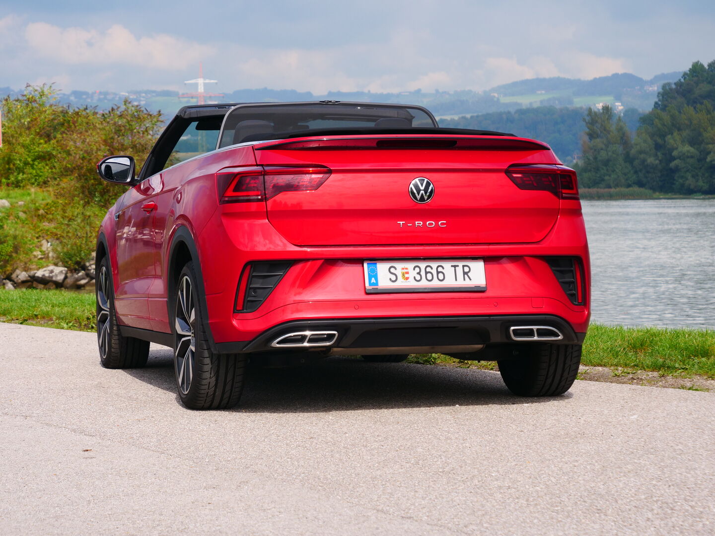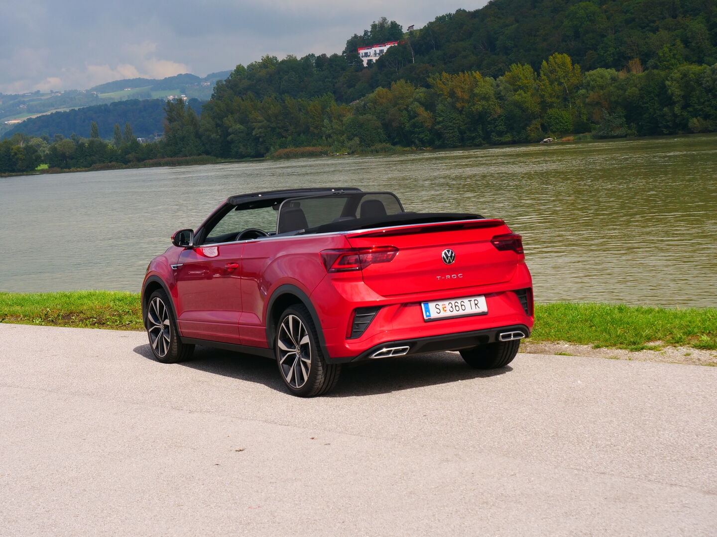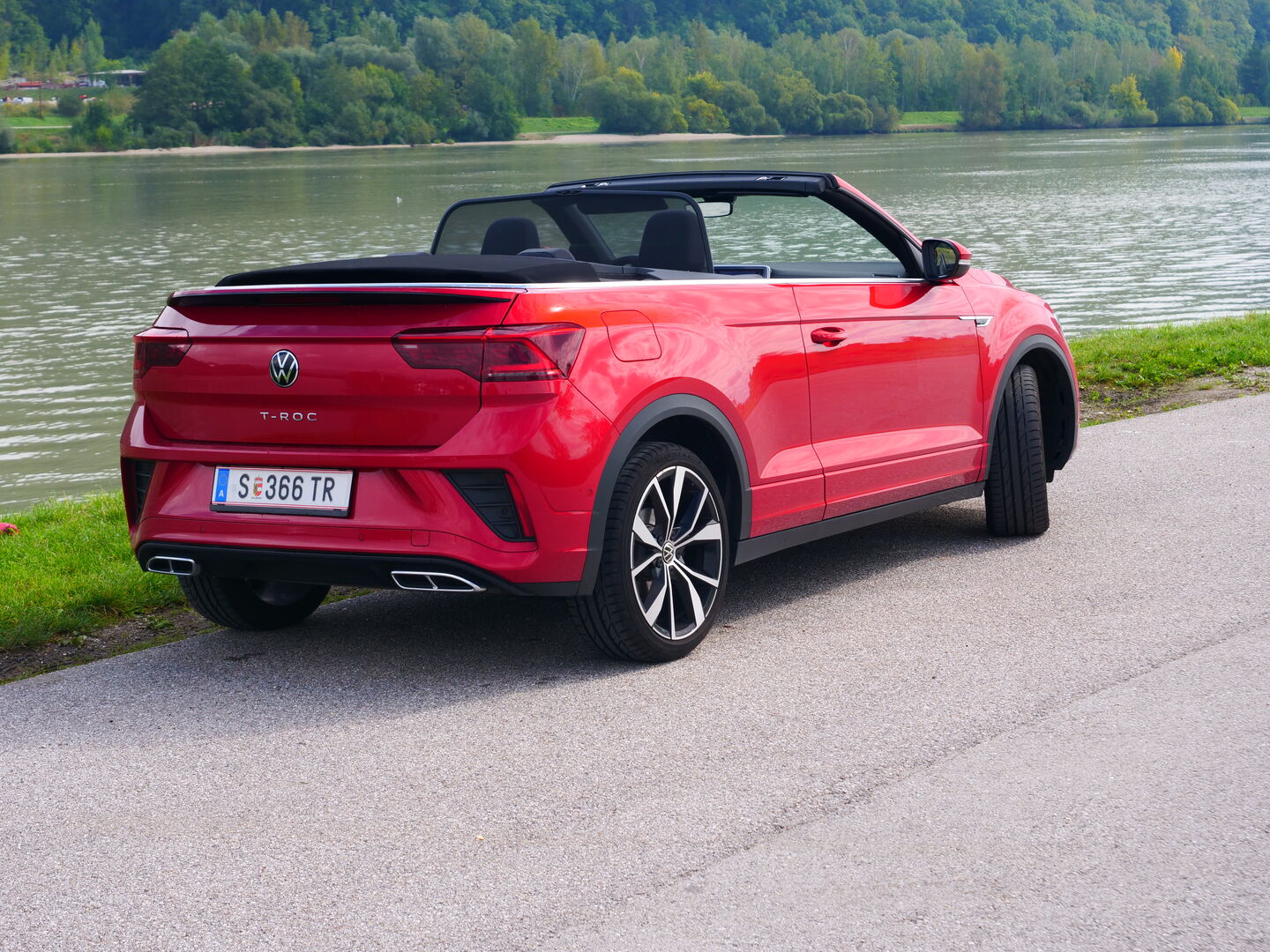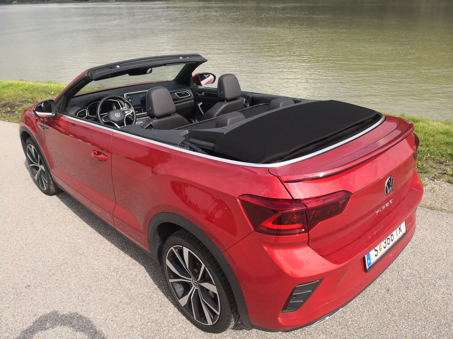 Das Kofferraumvolumen fällt eher klein aus, was aber dem geschuldet ist, dass wir von einem Cabrio sprechen. Cabrios mit großem Kofferraum gibt es de facto nicht. Im Falle des T-Roc sind es 284 Liter Ladevolumen. Fahrer und Beifahrer haben gute Platzverhältnisse – ohne Abstriche. Auf den hinteren Rängen geht es etwas enger zu. Langstrecken sind so gesehen für Mitreisende auf den Rücksitzen (2 Personen) eher anstrengend. Aber auch das ist „typisch Cabrio“. Das Stoffverdeck öffnet vollautomatisch in neun Sekunden. Wenn Regen aufkommt, schließt es sich in elf Sekunden. Das Ganze geht auch während der Fahrt. Vorausgesetzt man fährt langsam genug. Genauer gesagt 30 km/h. Wir möchten ja nicht, dass uns das Dachl um die Ohren fliegt. Aber das lässt die Technik ohnehin nicht zu. Das Testcabrio war mit einem 150-PS-TSI ausgerüstet, der ganz gut zum Auto passt. Auch das Zusammenspiel des 7-Gang-DSG mit dem 1.5 TSI geht als lupenrein durch. Zusätzlich gibt es das T-Roc Cabriolet auch mit 110 PS und 6-Gang-Handschalter. Wobei wir eher die 150-PS-Version empfehlen würden. Ein bisserl Fahrspaß schadet bei einem Cabrio sicher nicht. Eine 190-PS-Variante gibt es – im Gegensatz zu T-Roc mit Dach – nicht. Beim Verbrauch sprechen wir von kombiniert 5,5 Litern (NEFZ). Der Startpreis des T-Roc Cabriolet liegt bei 31.190,- Euro,-. Das Test-Cabrio in der R-Line und mit umfangreicher Zusatz-Ausstattung wie speziellen 19-Zoll-Alurädern lag bei einem Endpreis von 53.000,- Euro.