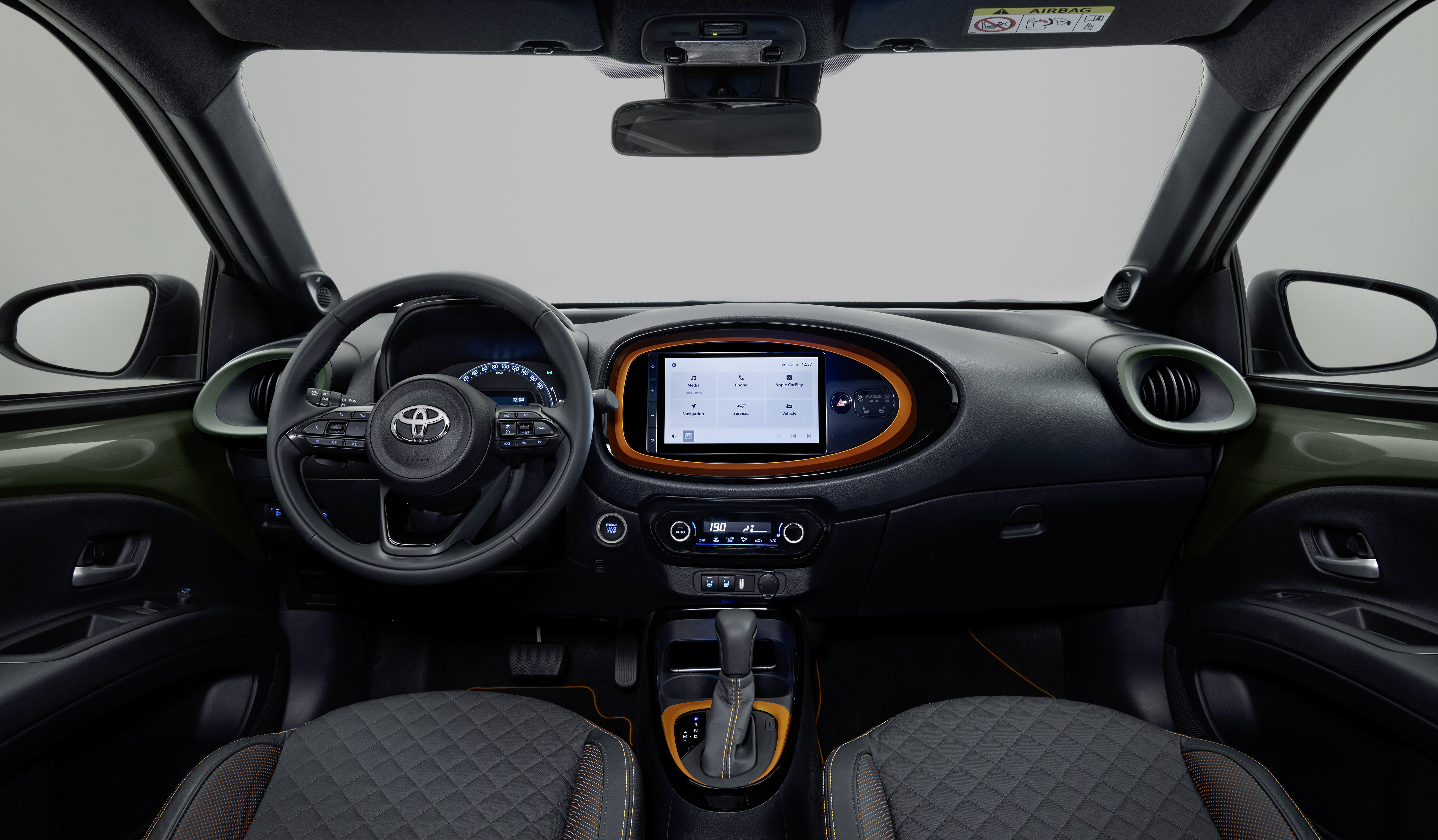 Aygo X. Der Aygo X wurde in Europa entwickelt und wird auch hier gebaut. Innen ist der 9-Zoll-Touchscreen der Blickfang. Unter der Haube werkt ein Einliter-Dreizylinder. Marktstart ist im April, Preise stehen noch nicht fest. Mit dem rundum neuen Aygo X stellt Toyota ein Crossover-Fahrzeug mit extrem kurzen Überhängen für das A-Segment vor. Sein Wenderadius beträgt 4,70 Meter. Die Karosseriebreite beträgt 1.740 Millimeter.