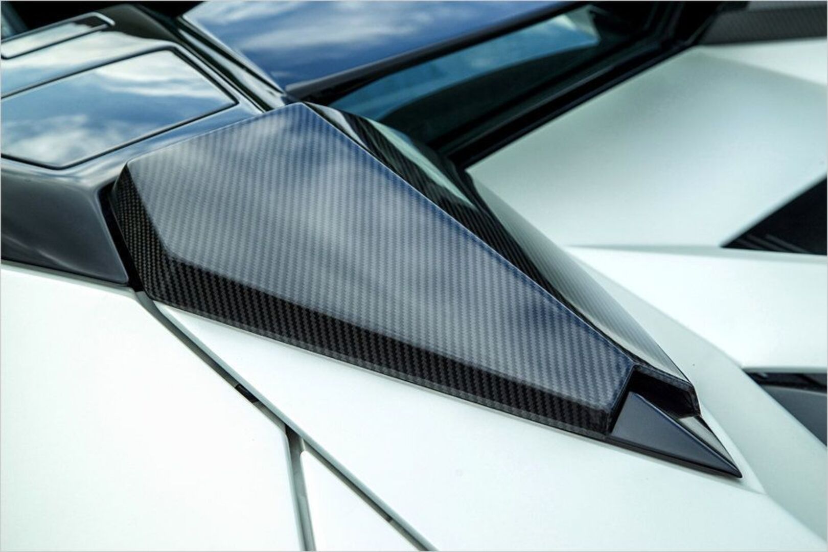 Im Fall des Aventador kommt mächtig viel Carbon zum Einsatz, das passend geformt nicht nur die Optik, sondern auch die Aerodynamik verbessert. Besonders auffällig sind neue Frontspoiler links und rechts, die mit Unterstützung eines mittigen Schwerts den Fahrtwind zerschneiden. Zudem wird die Kofferraumhaube verändert, sie bekommt neue Luftauslässe vor der Windschutzscheibe. Markante Schwellerleisten und Carbon-Spiegelcover sorgen in der Seitenlinie für einen aufregenden Look. Auf dem Heck thront ein mächtiger Flügel, der automatisch bis zu einer Geschwindigkeit von 180 km/h angehoben wird. Die Luftströme werden außerdem von einem neuen Diffusor in der Heckschürze in die rechten Bahnen gelenkt.