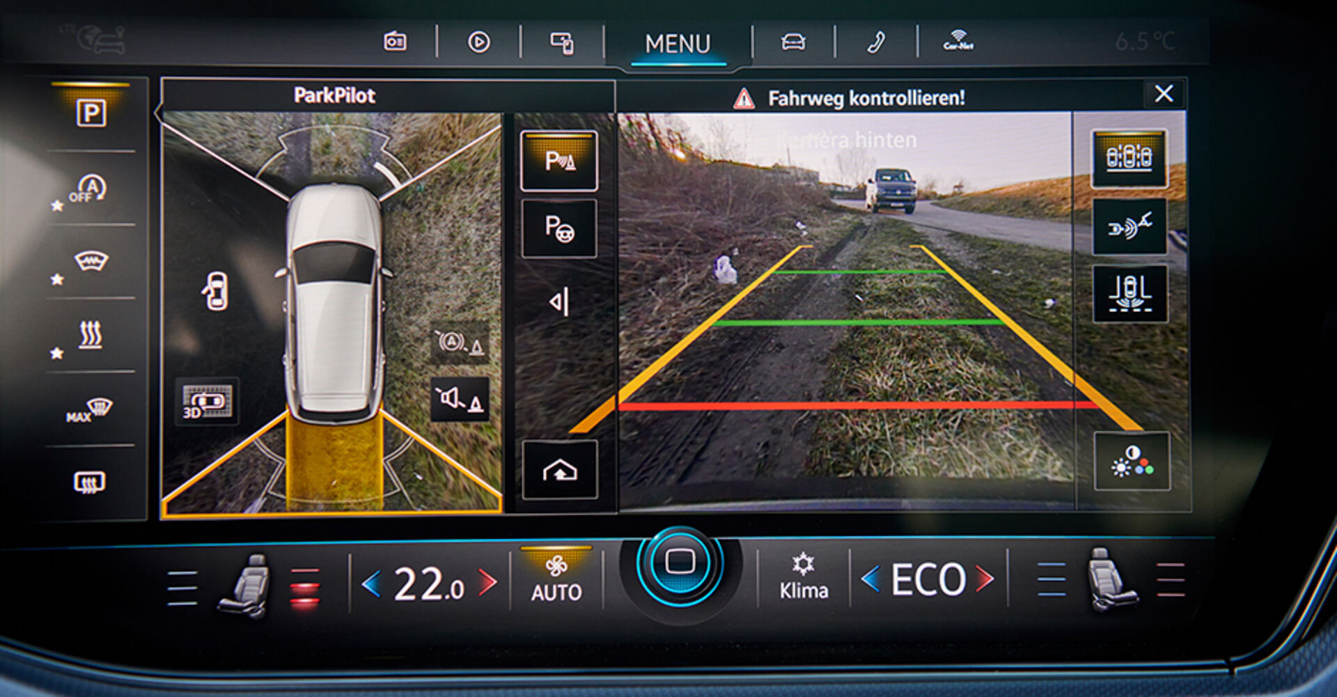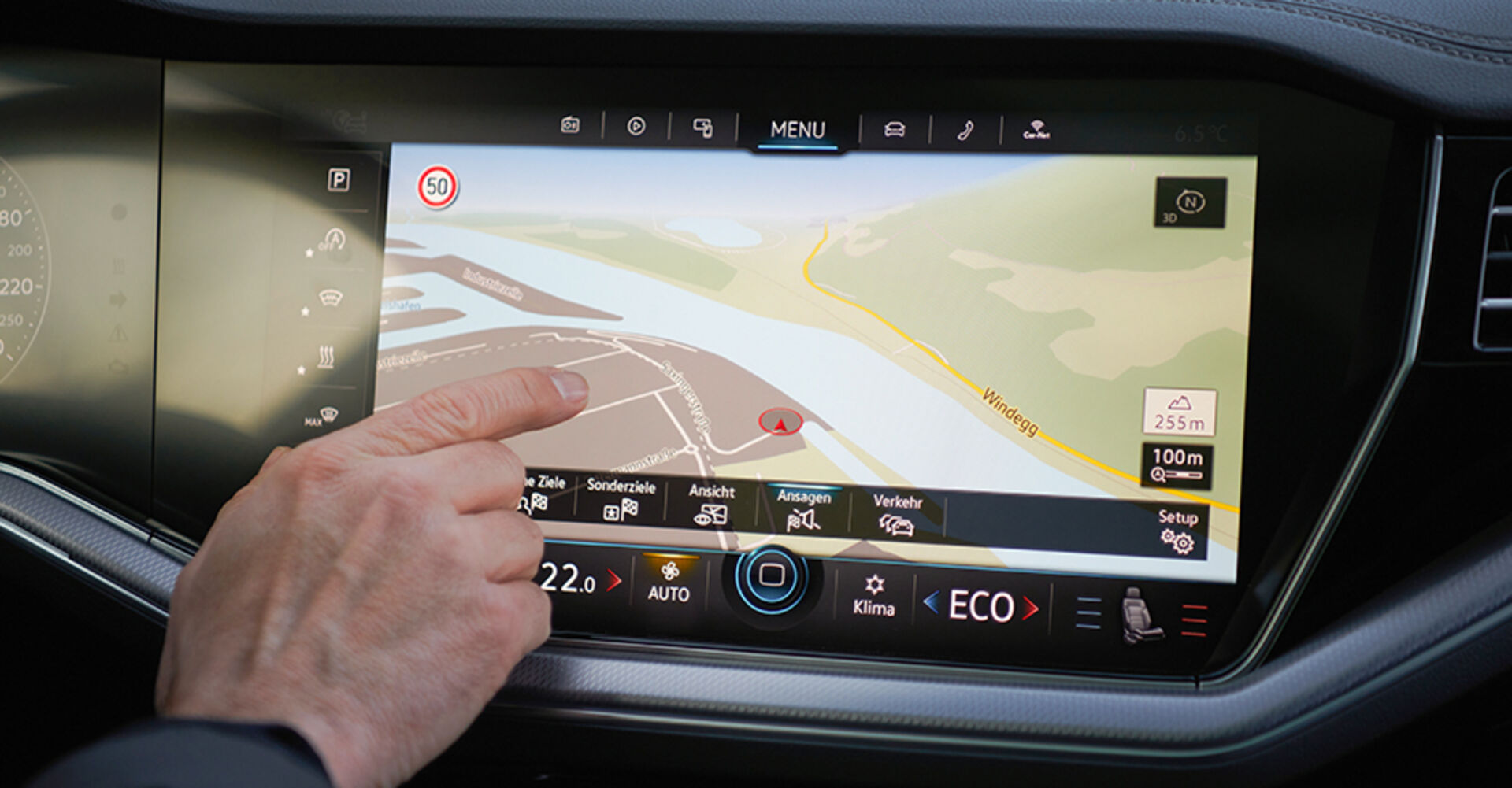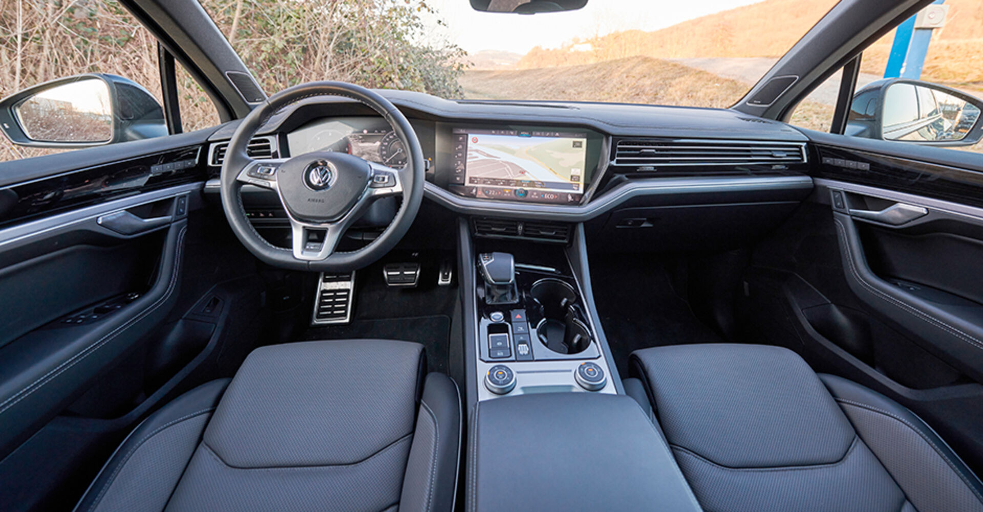 Solange dem Touareg kein Leben eingehaucht, also die Zündung eingeschaltet wird, überzieht ein schwarzes großes Etwas die gesamte Fahrzeugbreite im Bereich des Armaturenbretts. Mit Strom wird daraus eine senstionelle Screen-Landschaft. Das "Innovision Cockpit" besteht aus zwei verschmolzenen Screens mit 12 Zoll (Instrumente - Tacho und Co) sowie einem riesigen 15-Zoll-Schirm, über den praktisch alles abgewickelt werden kann. Die Menüs sind durchschaubar und übersichtlich. Trotzdem hätten wir uns beispielsweise für Klima und Co. einige "altbewährte" Knopferl gewünscht. Ansonsten gibt es im Innenaum, wie zu erwarten, hohe Verarbeitungsqualität. Vielleicht trägt ein Touareg im Vergleich zur Premium-Konkurrenz von Audi, Mercedes oder BMW etwas weniger dick auf, aber es muss eh nicht immer alles in Richtung Opulenz gehen. Die Platzverhältnisse? Der Kofferraum hat 810 bis 1.800 Liter Volumen - noch Fragen?