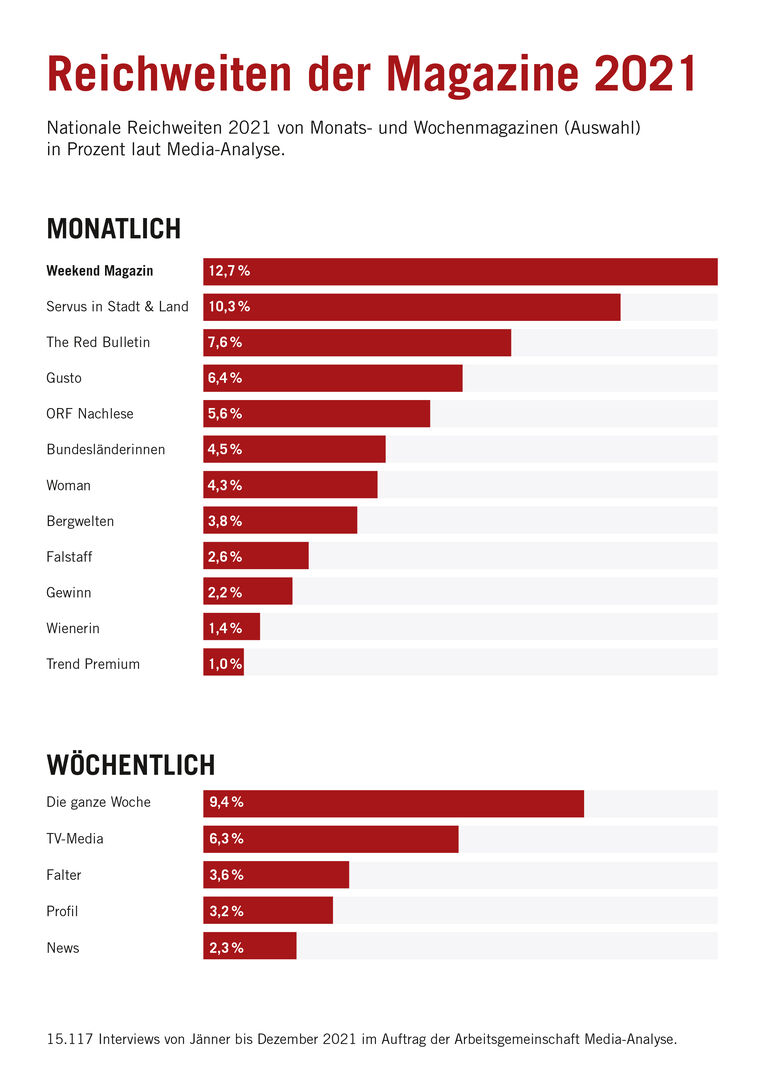 Quelle: *Media-Analyse 2021, Erhebungszeitraum: Jänner – Dezember 2021, 15.117 Interviews, Reichweite national 14+: 12,7 %, Schwankungsbreite: ±0,5%, monatlich; **Media-Analyse 2021 im Vergleich zu Media-Analyse 2020, Erhebungszeitraum: Jänner-Dezember 2020, 14.449 Interviews, Reichweite national 14+ 10,1 %, Schwankungsbreite: ±0,5%; 14-tägig; Weekend Magazin ist kostenlos und erscheint in Bundeslandmutationen.