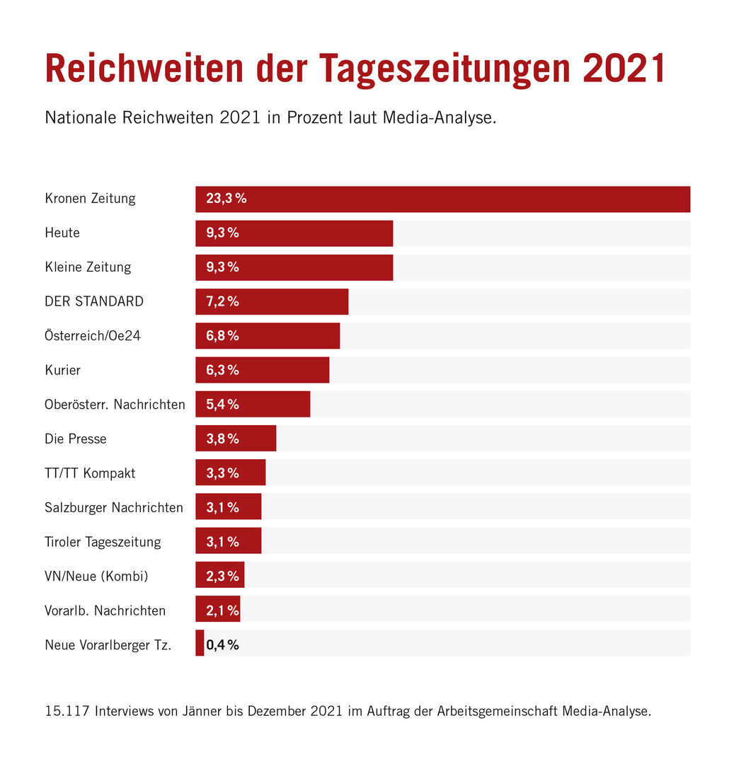 Die Reichweite der Tageszeitungen gesamt ist signifikant gesunken. Sie sank von 58,3 Prozent Reichweite auf nunmehr 55,4 Prozent. Marktführer „Kronen Zeitung“ verlor signifikant von 25 auf 23,3 Prozent. Aber auch Presse, Kleine Zeitung und Tiroler Tageszeitung haben im Vergleich zu 2020 verloren.