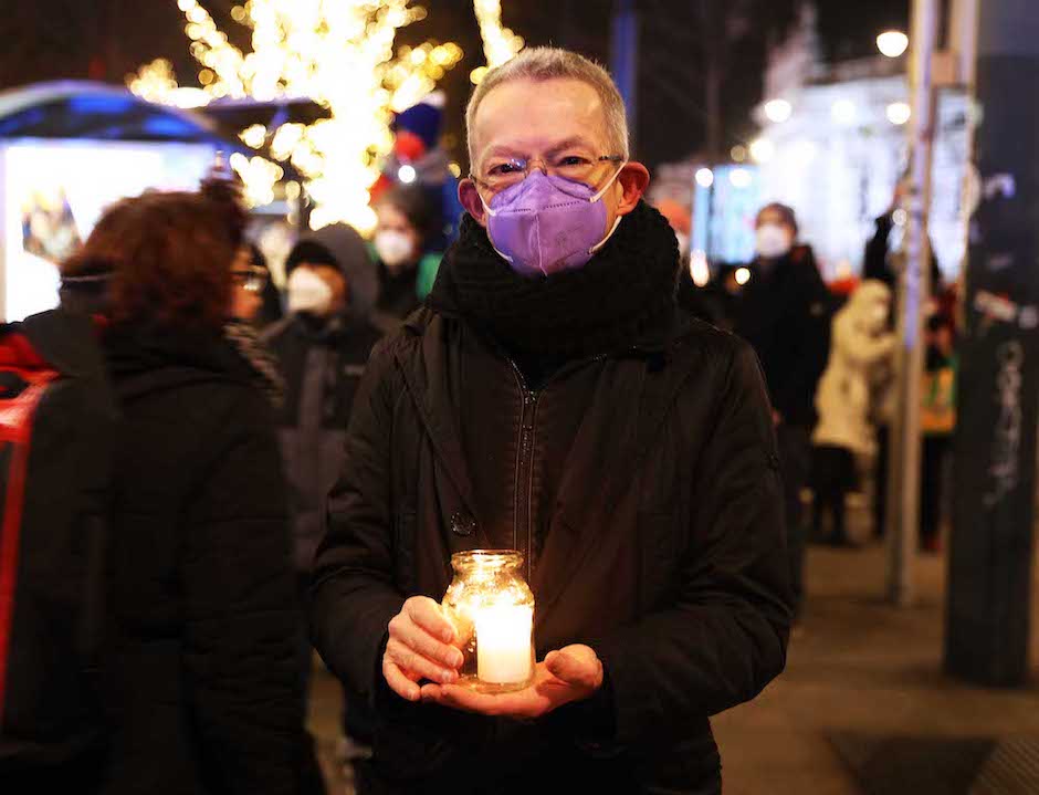 Sonntag, 18:45 Uhr: Die Menschen haben Kerzen, Lampen oder Lichterketten mitgebracht, viele schalten die Taschenlampe ihrer Handys ein. Freundesgruppen, Familien mit Kindern, aber ebenso zahlreiche ältere TeilnehmerInnen sorgen für eine lückenlose Menschenkette. So gut wie alle tragen Maske. Die Polizei hat den Ring für den Verkehr gesperrt, zögerlich betreten erst einige, dann immer mehr Menschen die Fahrbahn.