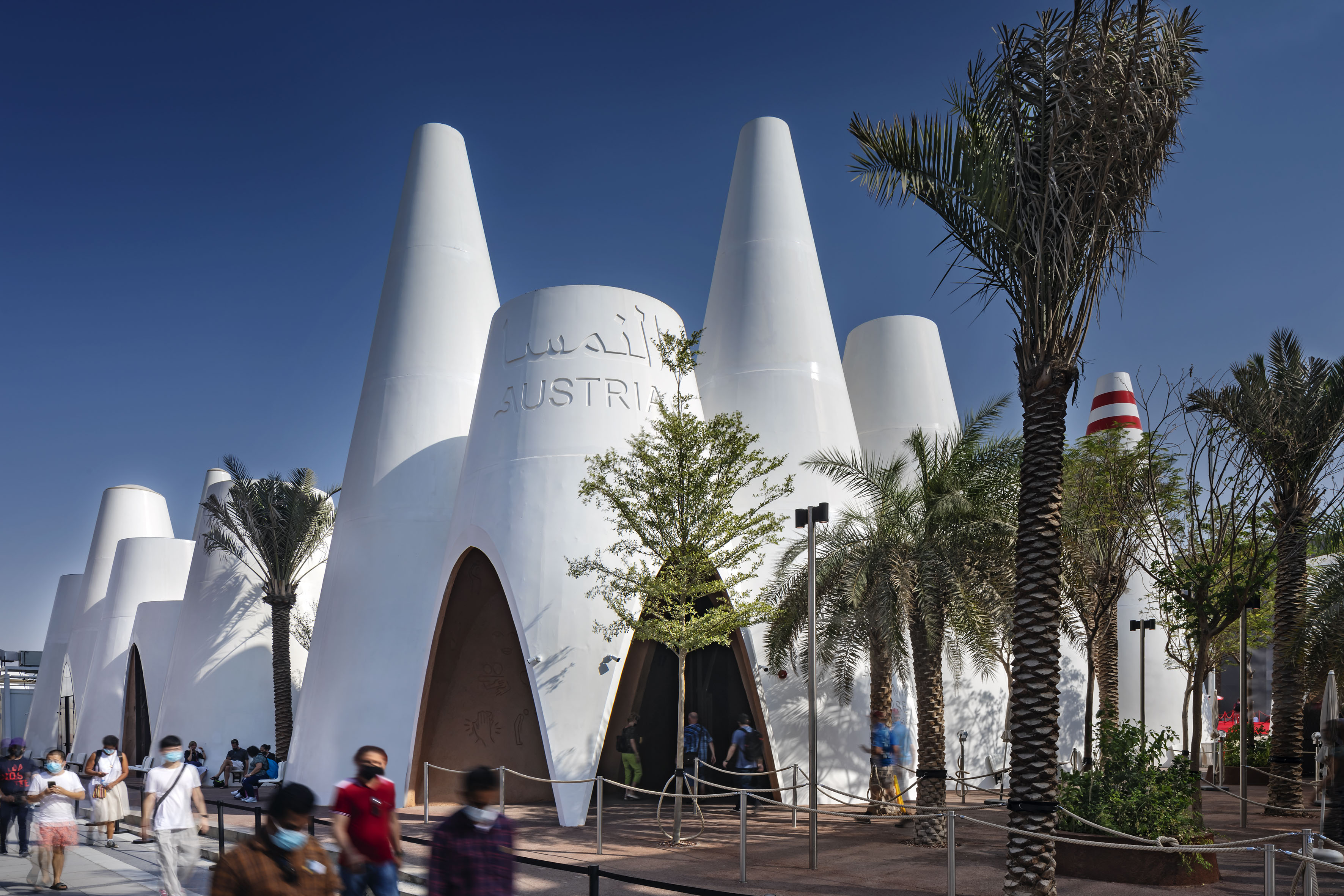 Der von Wirtschaftsministerium und Wirtschaftskammer bezahlte Pavillon besteht aus 38 unterschiedlich hohen Kegeln aus Stahlbeton-Fertigteilen. Außen fleckig-weiß gestrichen, innen mit Lehm verputzt. Das Bauwerk, das aus der Vogelperspektive wie eine vorsintflutliche Raketenabschussbasis ausschaut, hat 17 Millionen Euro gekostet.