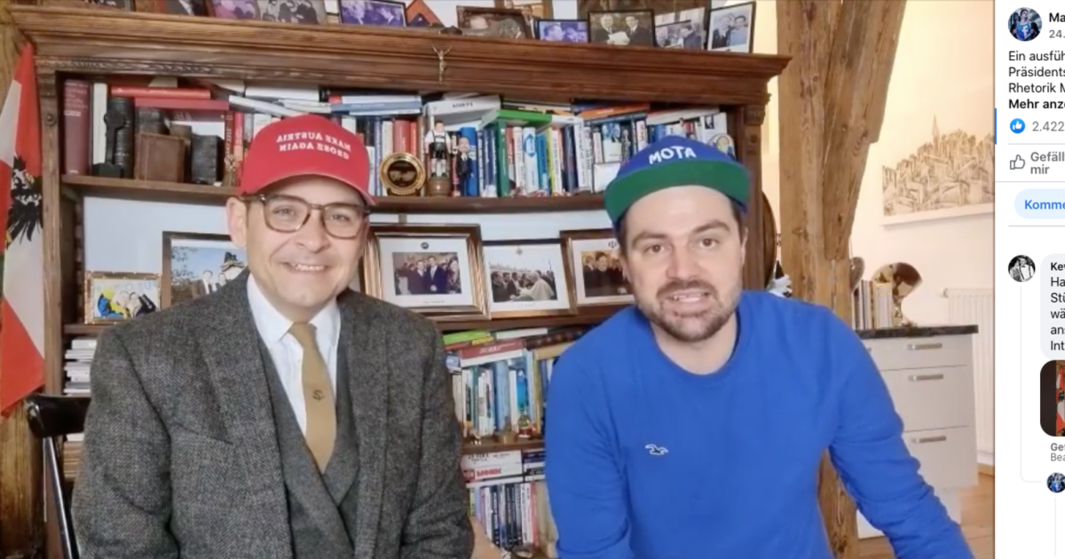 Mit seinem Outfit, man beachte die rote Kappe, erinnert Grosz an zwei durchaus legendäre Persönlichkeiten: Ex US-Präsident Donald Trump und Formel-1-Star Niki Lauda. Ersteren ehrt er übrigens mit einem abgewandelten Slogan. Statt „Make America Great Again” steht auf der Kappe „Make Austria Grosz Again”.