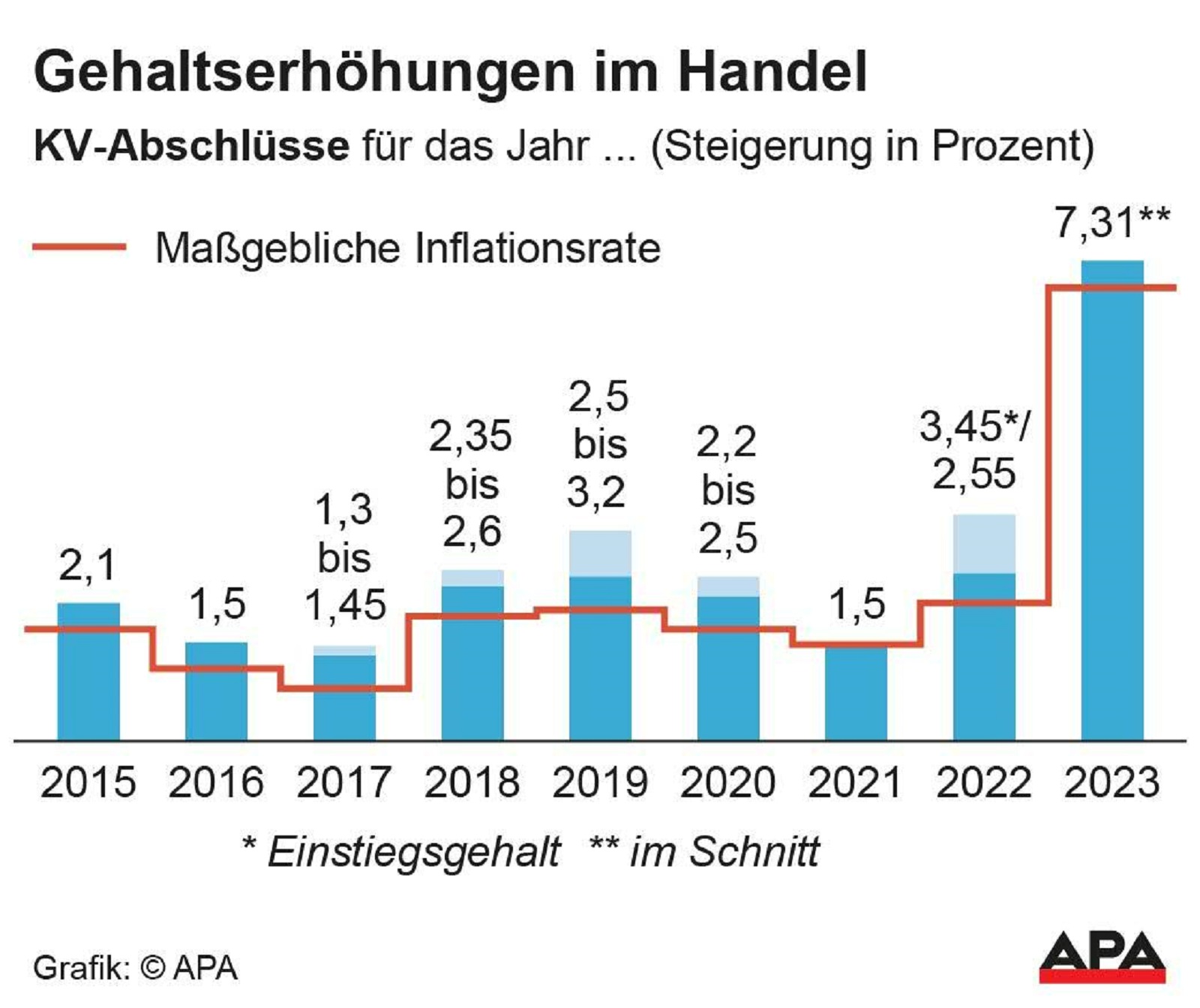 GPA und Arbeitgeber haben einen neuen Kollektivvertrag für die rund 430.000 Angestellten und Lehrlinge im Handel ausgehandelt. Gehälter und Lehrlingsentschädigungen steigen laut Gewerkschaft GPA im Schnitt um 7,31 Prozent. Für kleinere Einkommen bedetuet dies ein Plus von mindestens 145 Euro brutto. Durch den Mindestbetrag bedeute dies eine Erhöhung um bis zu 8,67 Prozent. Das Einstiegsgehalt für Berufseinsteiger nach der Lehre wird um 8,06 Prozent von derzeit 1.800 auf 1.945 Euro angehoben. Bestehende Überzahlungen bleiben aufrecht. Für Lehrlinge gibt es eine Erhöhung zwischen 8 und 9,6 Prozent. Im ersten Lehrjahr wird auf 800 Euro, im zweiten Lehrjahr auf 1.025 und im dritten auf 1.350 Euro angehoben.