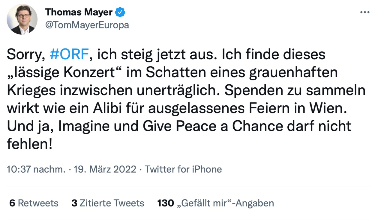 In der Tat wurde von den Organisatoren an die Eigenverantwortung der Konzertbesucher appelliert. „Drei G“ und Maske waren lediglich empfohlen, nicht vorgeschrieben - was aber durchaus im Einklang mit den am Wochenende (noch) geltenden Corona-Vorschriften für Outdoor-Veranstaltungen war. Kritisiert wurde das Event aber auch als „pietätlos". So meint der schon erwähnte Thomas Mayer, dass ORF-Moderator Andi Knoll nicht den richtigen Ton getroffen und sich vor allem am „Comeback der Stars“ berauscht habe. Mayer ätzt auch über den „Give Peace a Chance-Kitsch“ des Finales. Noch während der Veranstaltung twittert er das: