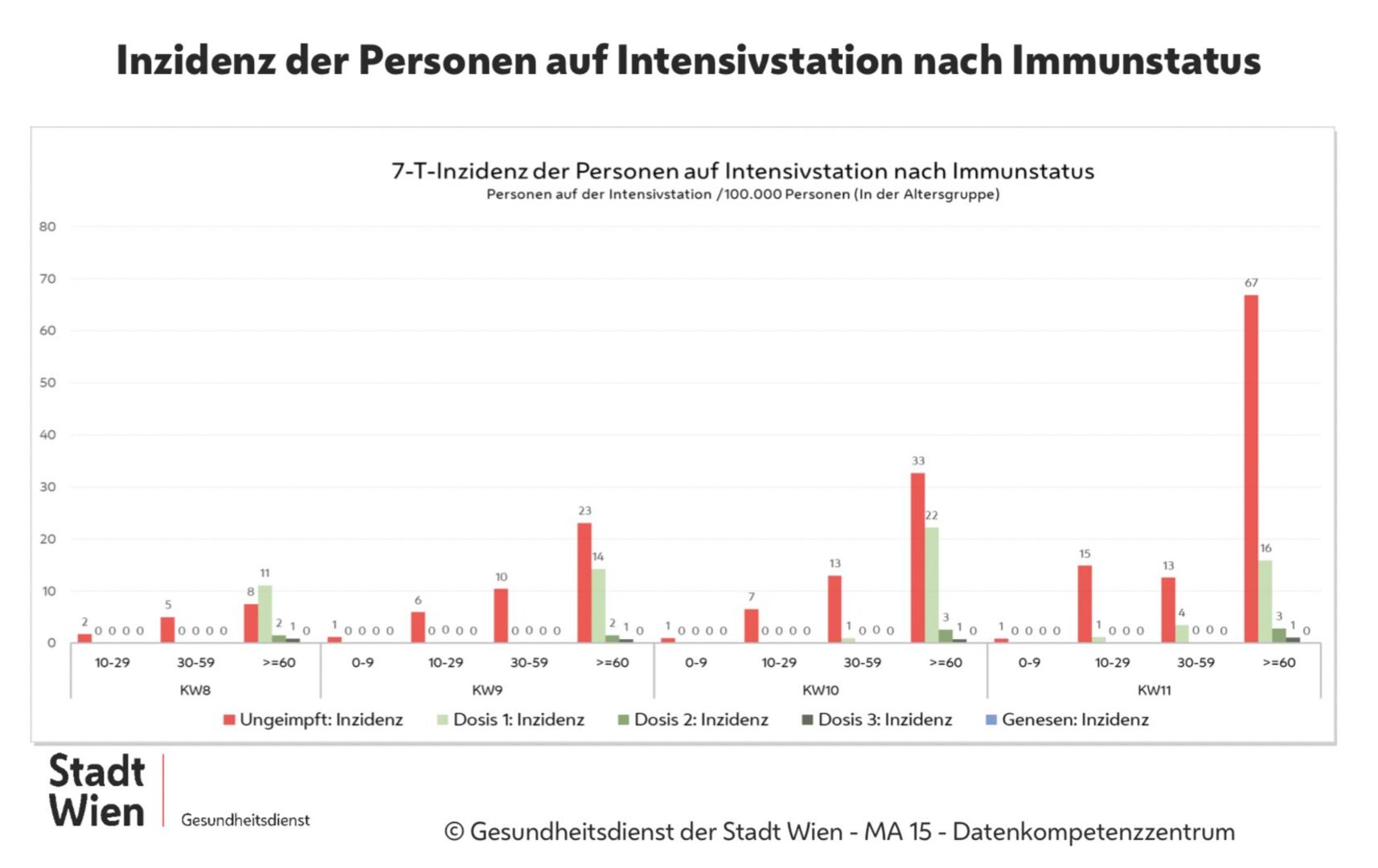 Den Impfstatus von hospitalisierten Covid-Patienten zu erfassen, ist scheinbar naheliegend, wurde aber bisher in den meisten Bundesländern verabsäumt. Nur Wien ist da eine Ausnahme. Von kw 8 bis kw 10 nimmt die Zahl der Covid-19-Patienten auf den ICU-Stationen stark zu. Die Zahl der ungeimpften Intensivpatienten steigt von 19 auf 96 (etwa das sechsfache), jene der Patienten, die es trotz Impfung ganz schwer erwischt hat, erhöhte sich von 14 auf zuletzt 25, was ungefähr einer Verdoppelung entspricht.