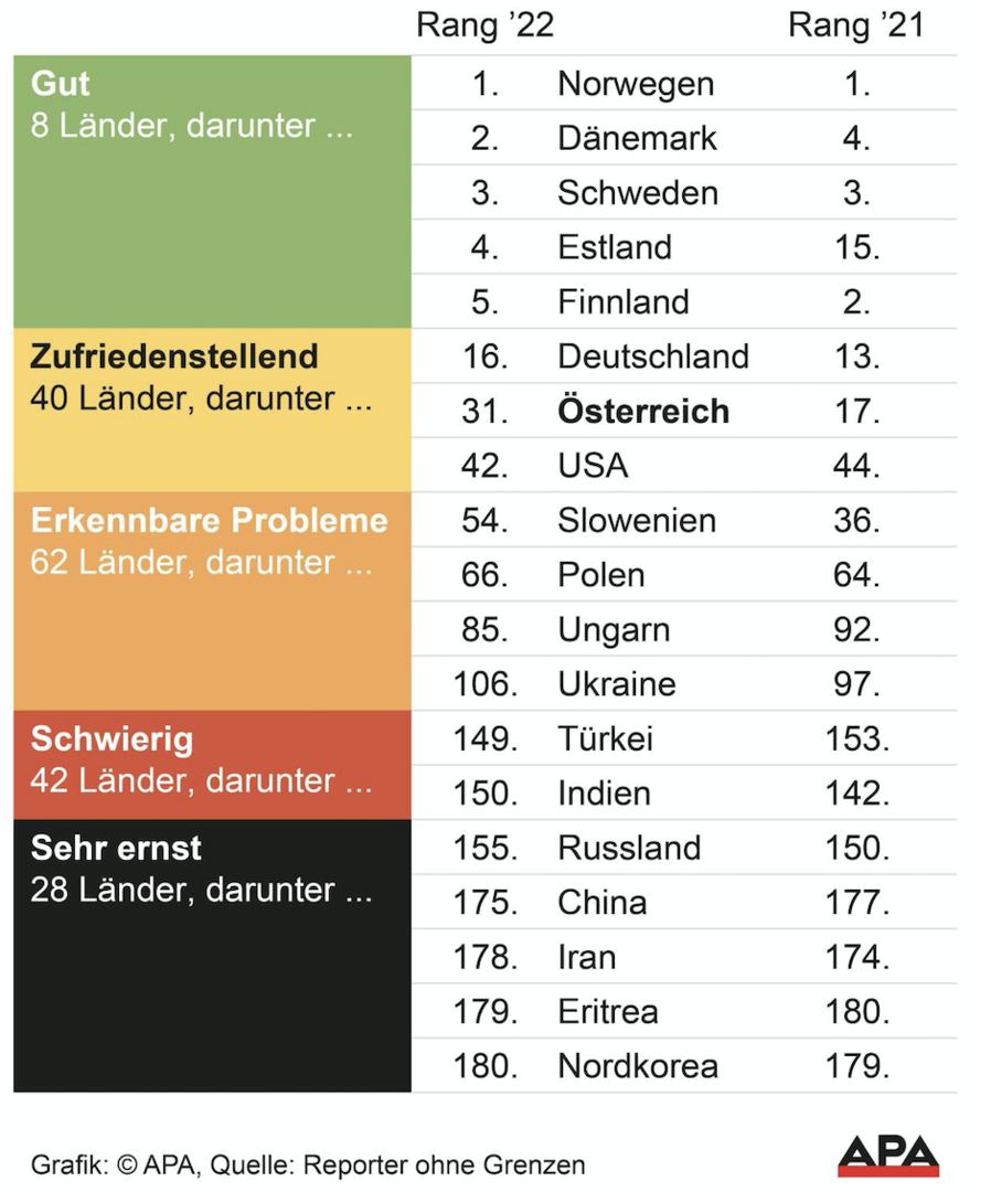 Österreich liegt demnach nur noch auf Platz 31 von 180 Ländern. In diesem Mittelfeld der Staaten herrscht nur eine "zufriedenstellenden" Pressefreiheit. Aus der Spitzengruppe war Österreich nach der Ibiza-Affäre im Jahr 2019 gefallen. Seither geht es weiter bergab: Im Vorjahr belegte es noch Platz 17.