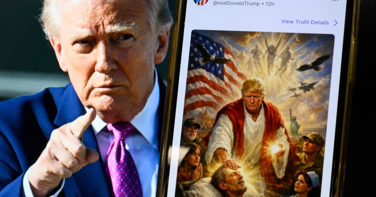 Trump Jesus: Donald Trump hat mit einem KI-generierten Bild, das ihn als Jesus-ähnliche Figur zeigt, weltweit eine Welle der Empörung ausgelöst. Die Darstellung zeigt den US-Präsidenten in einem weißen Gewand, wie er einem Mann die Hand auflegt und damit eine heilende Geste vollzieht.