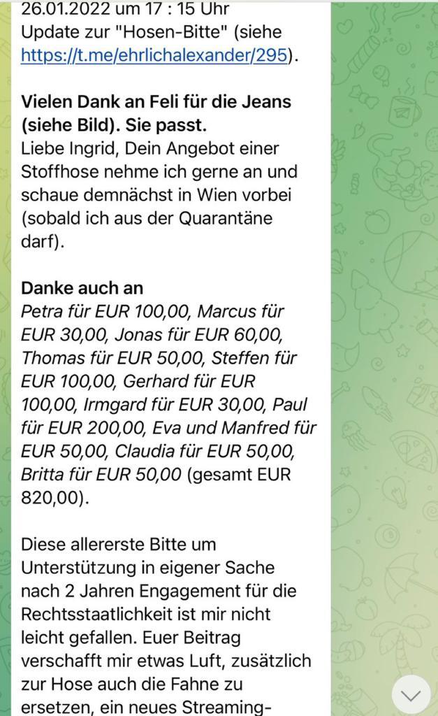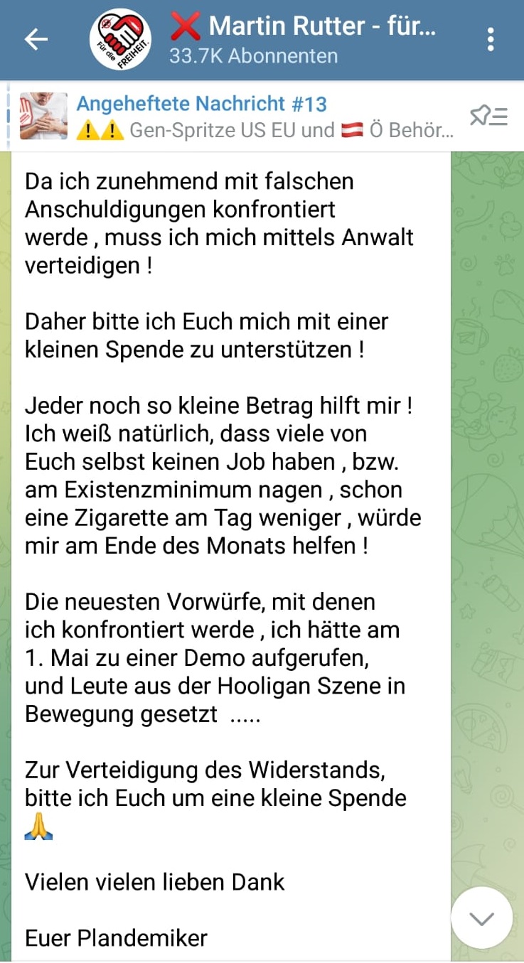 Auch Rutter bittet regelmäßig um Spenden, teils, um seine Anwaltskosten zu decken. Eine Strategie, derer sich auch Demo- und Querdenker-Kollege Hannes Brejcha bedient. „Da ich zunehmend mit falschen Anschuldigungen konfrontiert werde, muss ich mich mittels Anwalt verteidigen! Daher bitte ich Euch, mich mit einer kleinen Spende zu unterstützen! Jeder noch so kleine Betrag hilft mir!“, so Brejcha via Telegram. „Ich weiß natürlich, dass viele von Euch selbst keinen Job haben, bzw. am Existenzminimum nagen, schon eine Zigarette am Tag weniger, würde mir am Ende des Monats helfen!“