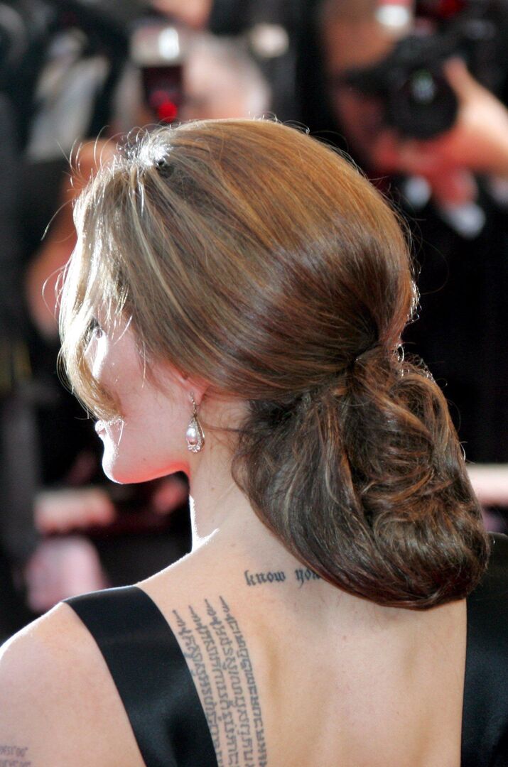 Den Nacken von Angelina Jolie zieren mehrere Schriftzüge. Zum einen „know your rights“ - ein Song ihrer Lieblingsband „The…