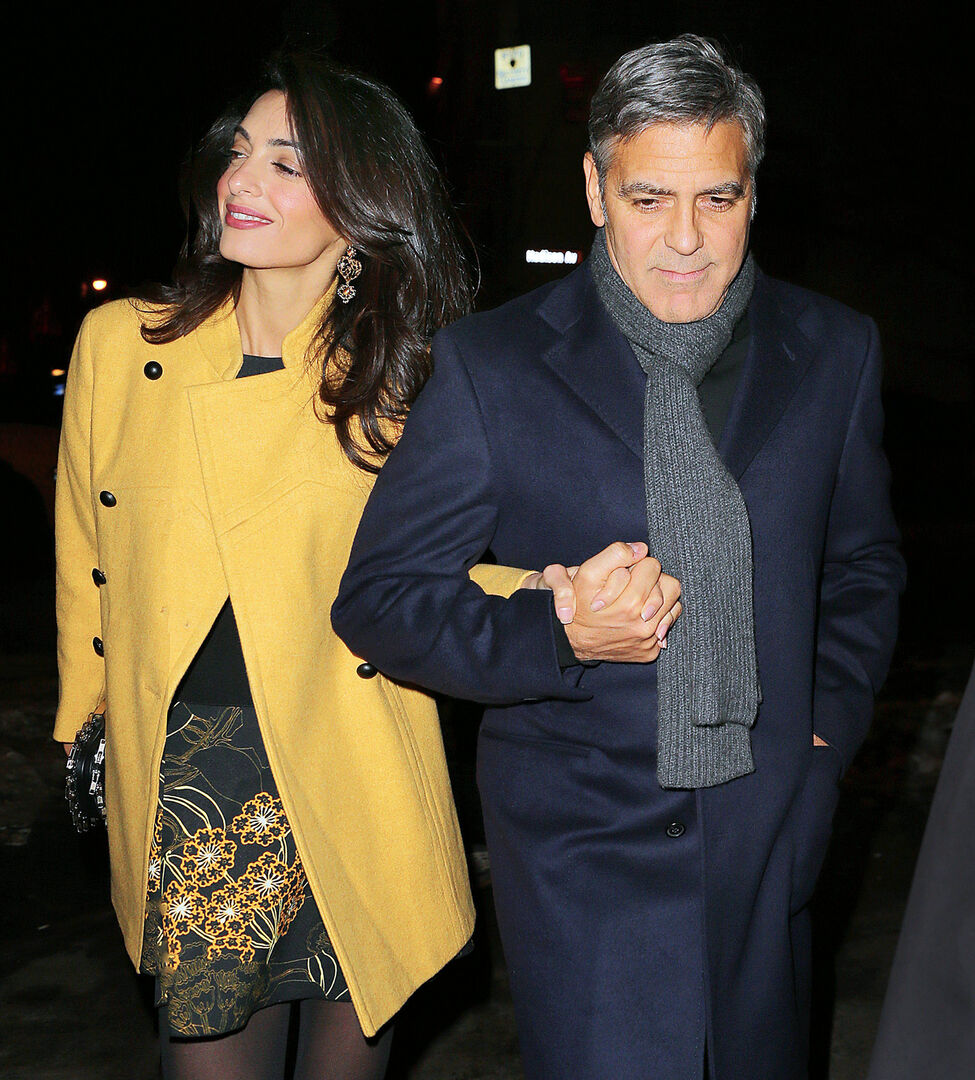 In einem hellgelben Mantel und floral verziertem Satin-Rock lässt sich Amal von ihrem George zu einem romantischen Date ausführen…