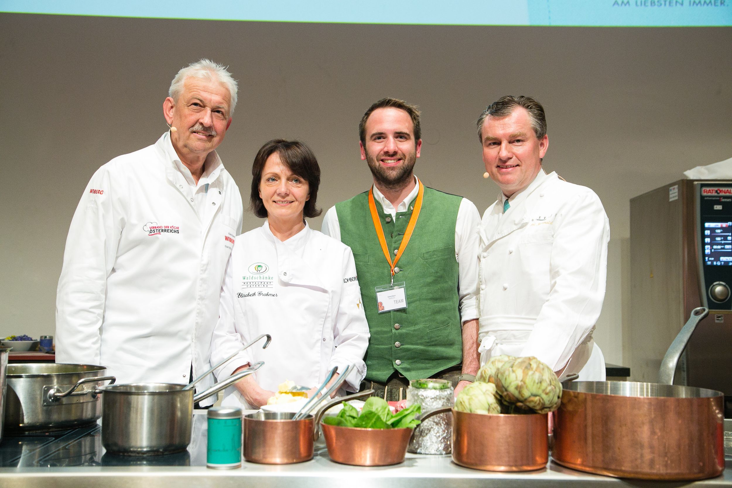 V. li.: Alois Gasser (Präsident des Verbands der Köche Österreich), Haubenköchin Elisabeth Grabmer, Junior-Chef Georg Resch und Haubenkoch Toni Mörwald.