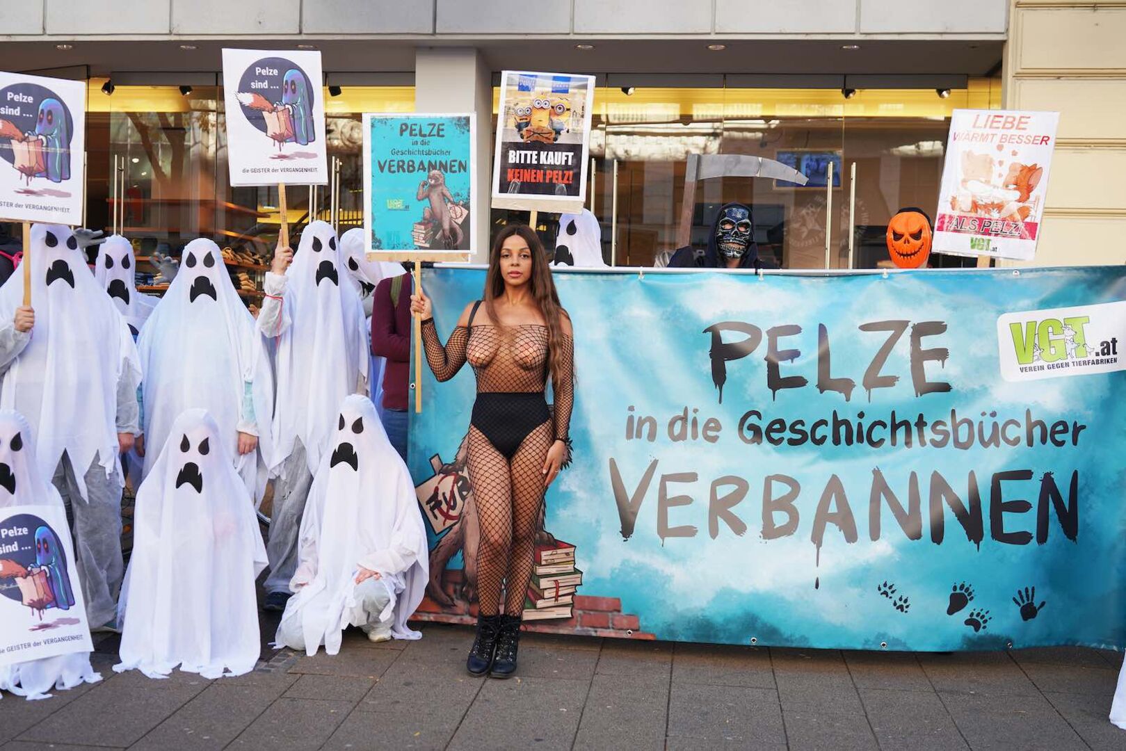 Unter dem Motto "Geister der Vergangenheit" sind laut VGT rund 250 Tierschützer vom Westbahnhof zum Stephansplatz gezogen. Ihr Anliegen: 25 Jahre nach der Schließung der letzten Pelzfarm in Österreich, sollte Tierfell endgültig aus dem Handel verschwinden und auch nicht mehr verkauft werden. Für Aufsehen haben insbesondere rund 20 als Geister und Sensenmann verkleidete Aktivisten gesorgt.
