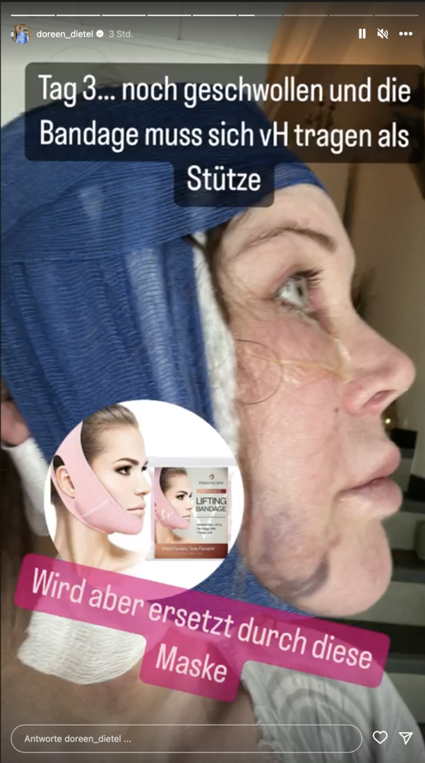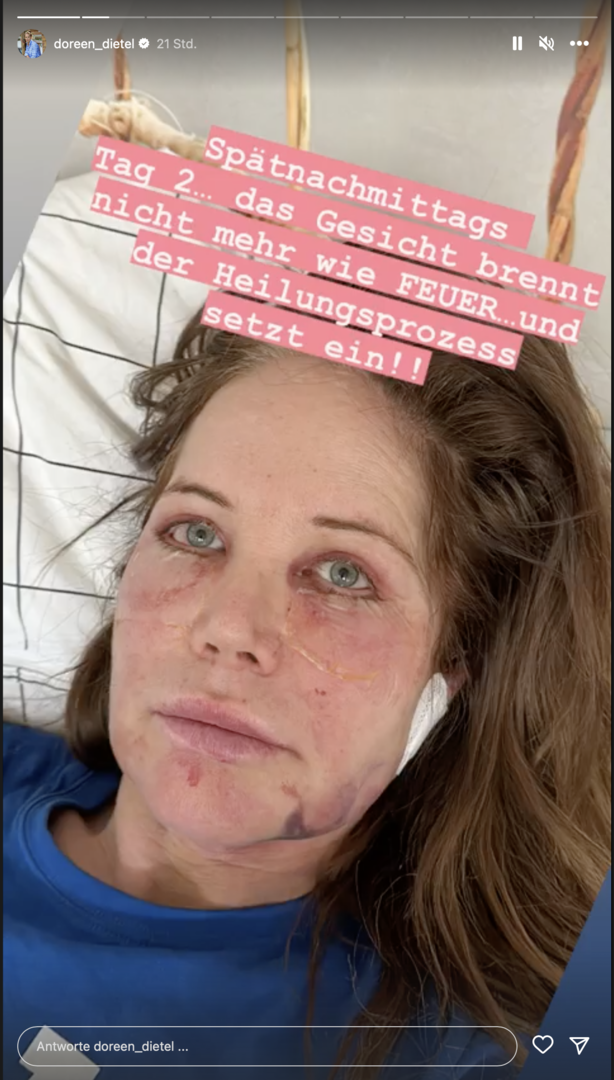 In ihren Stories beschreibt sie die Nachwehen ihres Beauty-Eingriffs mit einem sogenannten CO2-Laser, der gleichzeitig auch als Straffungslaser fungieren soll. An Tag 2 schreibt sie: "Das Gesicht brennt nicht mehr wie Feuer und der Heilungsprozess setzt ein." Und: "Momentan sehe ich schrecklich aus, mein ganzer Kopf ist stark angeschwollen."
