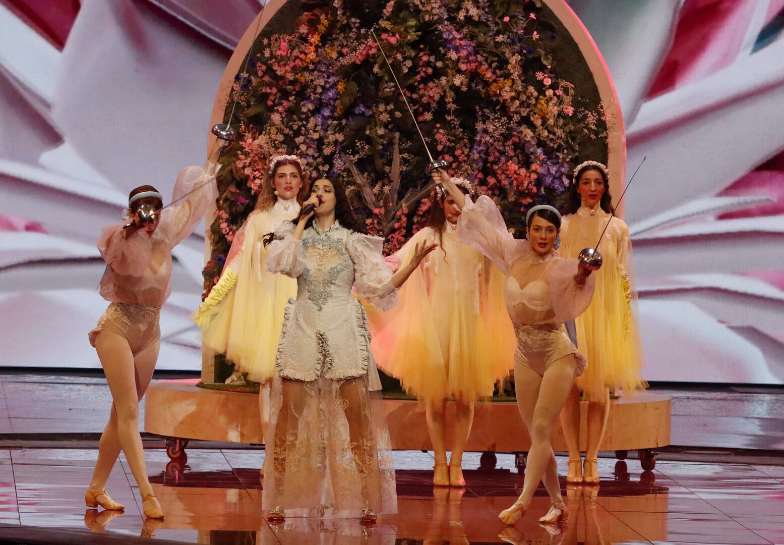 Alice im Wunderland: Der Auftritt der griechisch-kanadischen Sängerin Katerine Duska erinnerte an einen Märchenwald mit Fechteinlage. Viel Tüll, Blumen, Perlen und Choristinnen, die in fantasievollen Engelsgewändern voller Leichtigkeit mit Degen vor dem großen, rosafarbenen Deko-Element tanzten, das sich später in ein buntes Blumenbeet verwandelte. Gesanglich war die Performance eine der schwächeren mit ingesamt 71 Punkten.