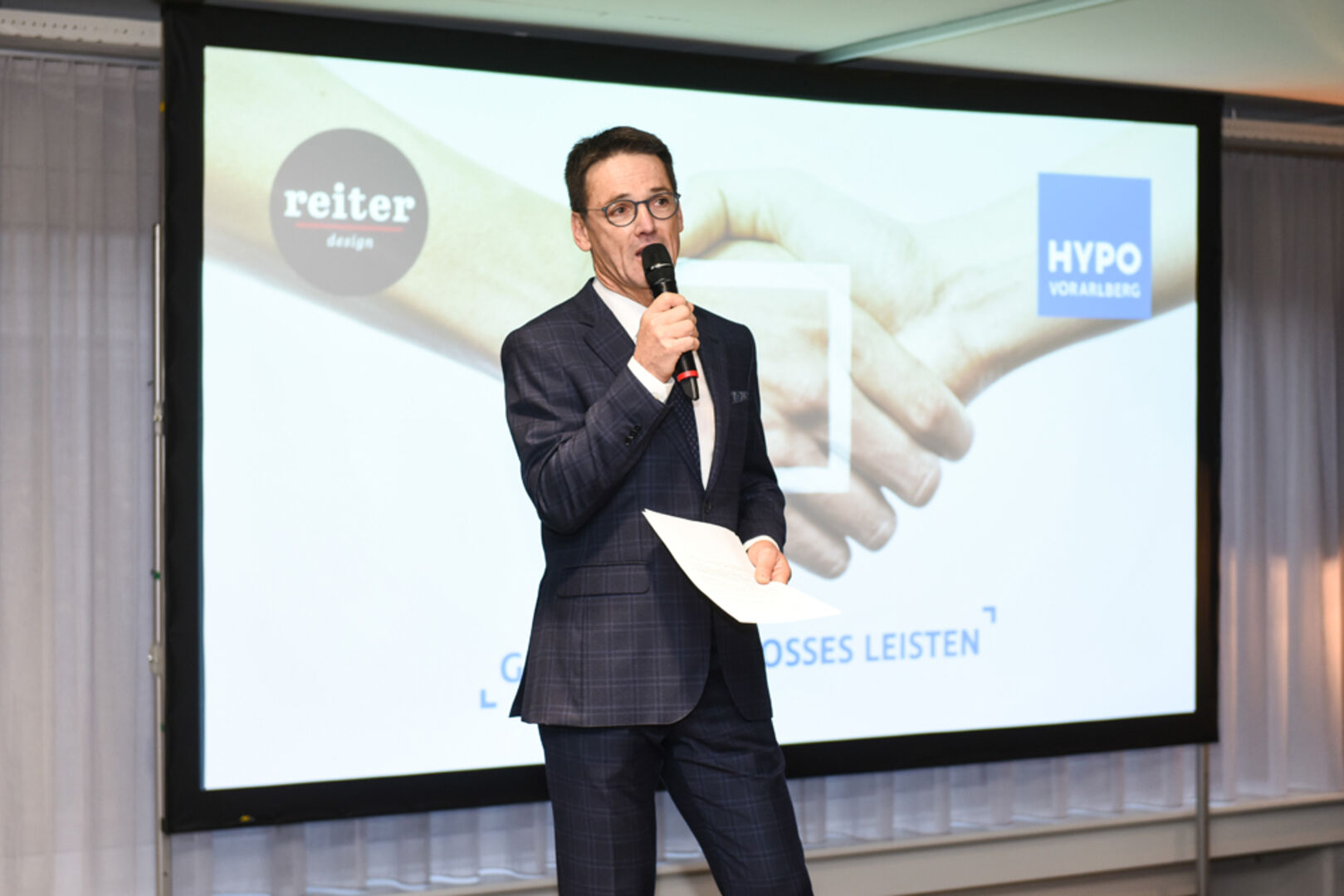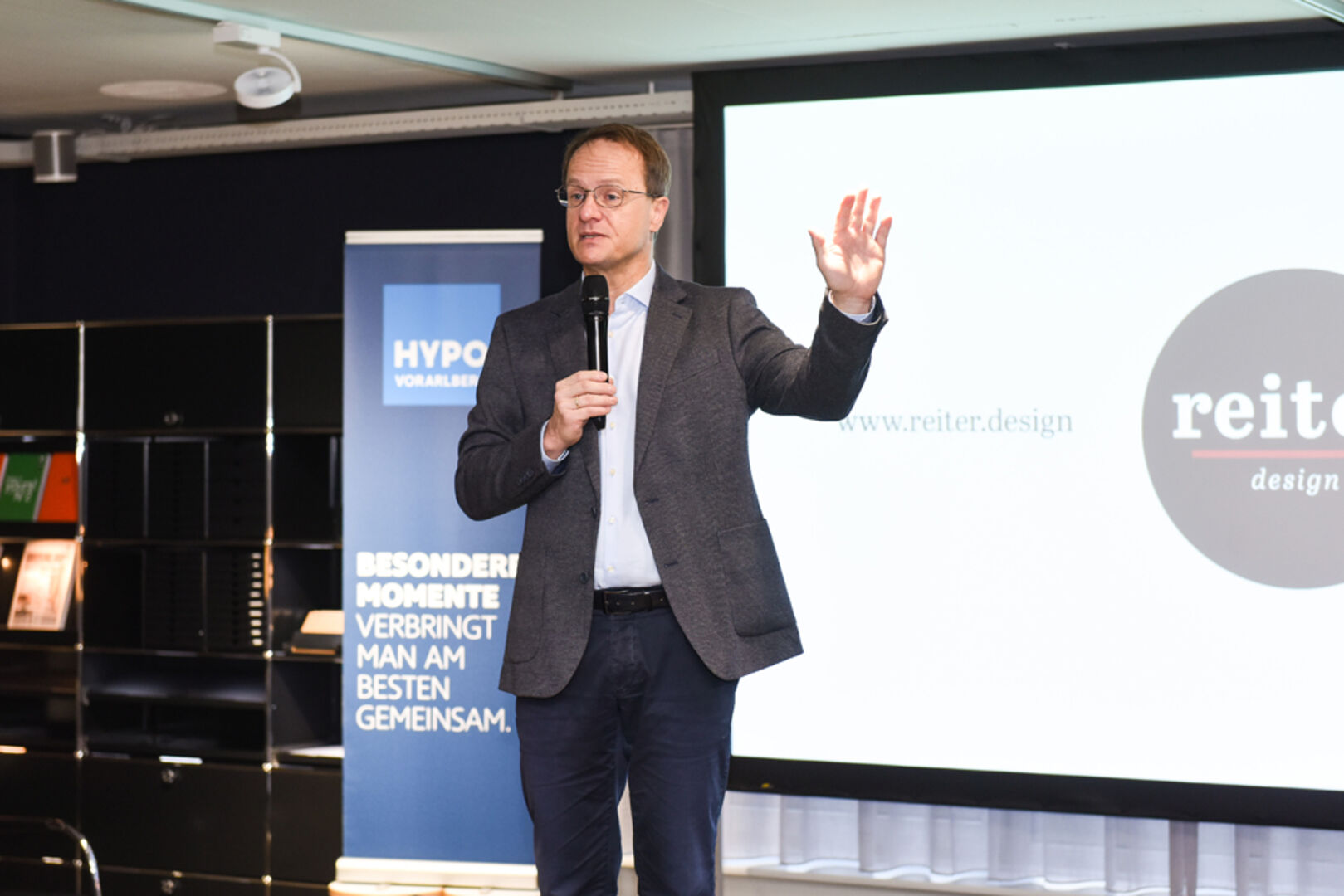 Rankweil, 26.11.2019. Über 250 Gäste folgten der Einladung der Hypo Vorarlberg und der reiter design gmbh in Rankweil zum traditionellen Unternehmerfrühstück. Referent Prof. Dr. Markus Hengstschläger fesselte die anwesenden Gäste mit seinen Theorien über Erziehung und Bildung und zeigte so die Folgen für unsere Gesellschaft sowie für die Wirtschaft auf.