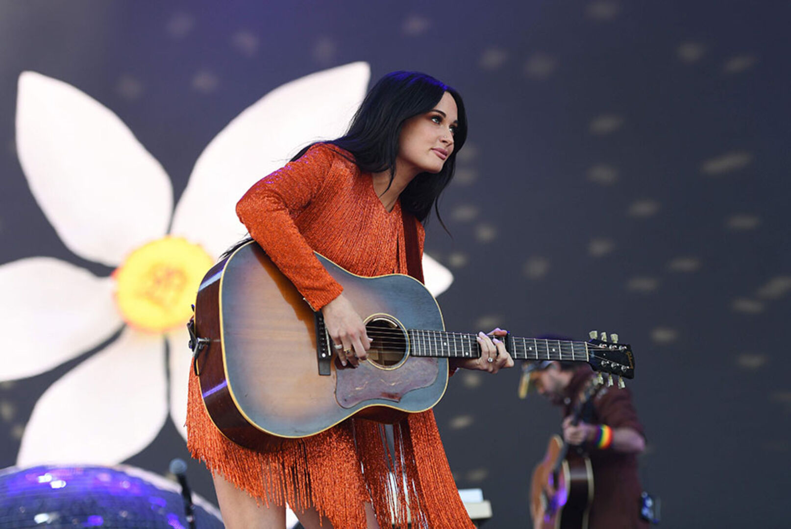 Bei ihren Konzerten setzt Musgraves modisch auf typische Country Style-Elemente: Erdtöne, Velourleder, Fransen und Western-Stiefel. Die Edel-Ausführung präsentierte sie beim Coachella Festival 2019 in Kalifornien mit diesem terrafarbenen Kleid im angesagten Sixties-Style.