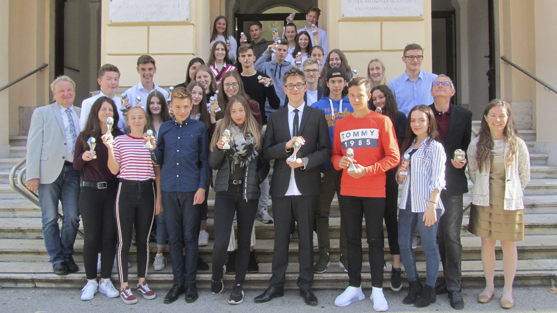 Direktor Franz Hudelist beim Gruppenfoto vor der HAK 1 mit AVH-Präsident Fritz Sporis und Organisatorin Josefine Schusch