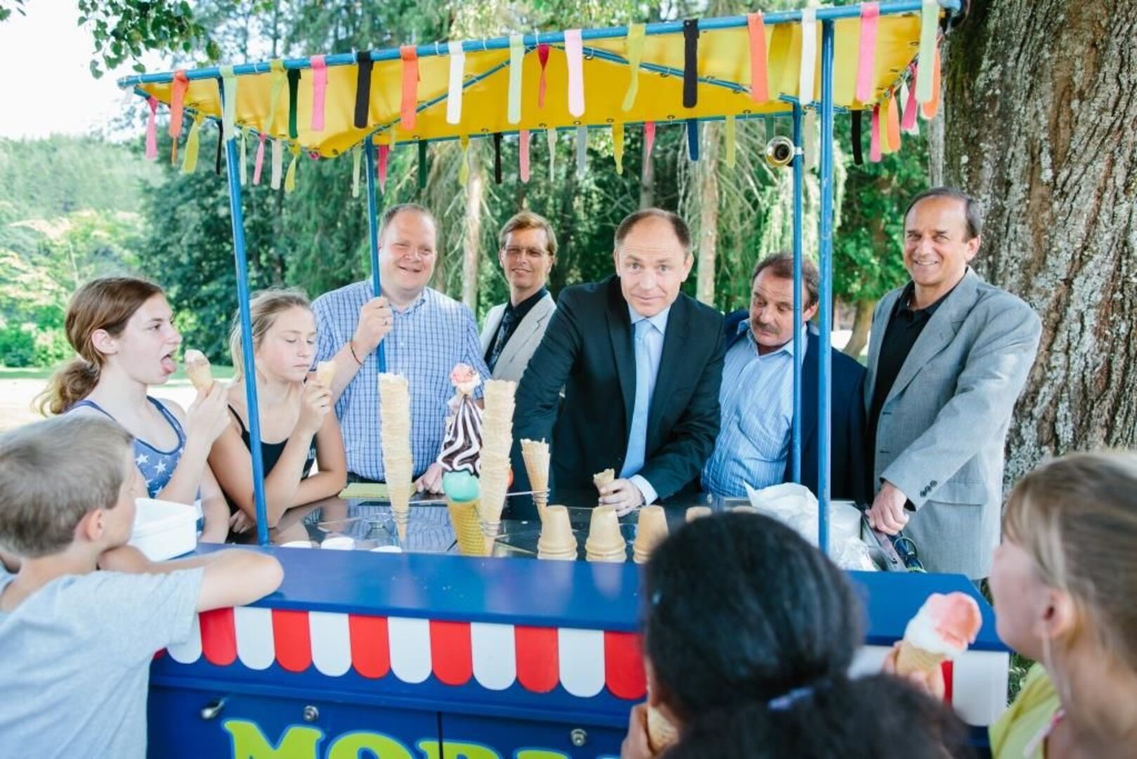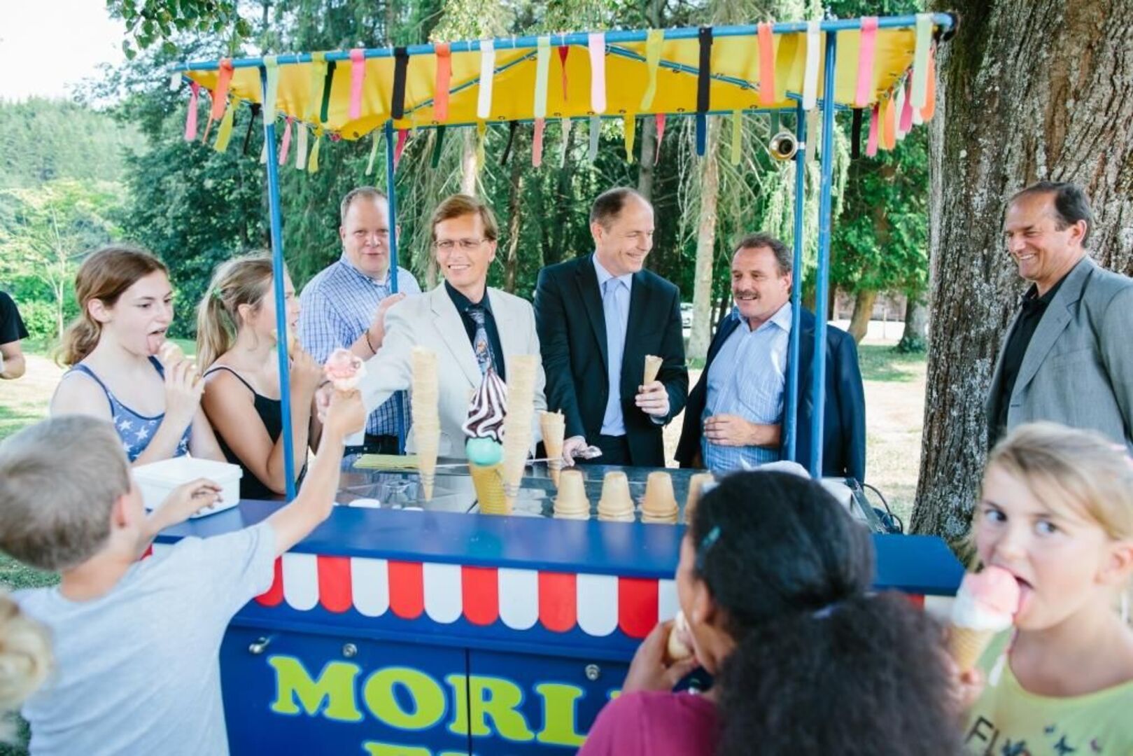 Oliver Heinrich teilt Eis für die kleinen Bewohner des Kinderdorf Moosburg aus.