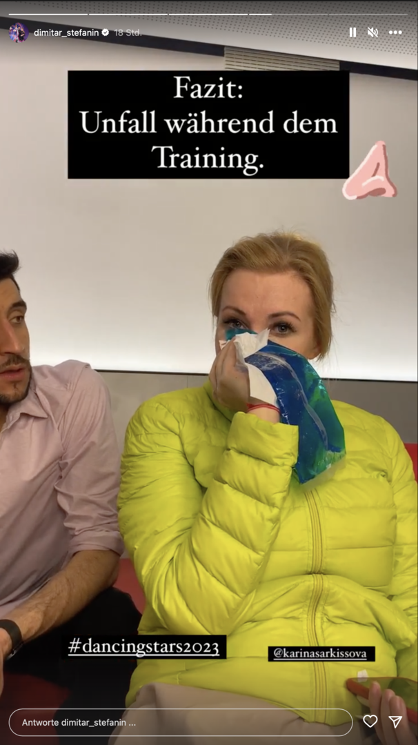 Hoch motiviert startete sie in das Training mit ihrem Partner Dimitar Stefani und kurz vor der ersten Show am Freitag schon wieder ein Tiefschlag. Beim Training brach sie sich offensichtlich die Nase wie Dimitri in seiner Instagram-Story zeigt.