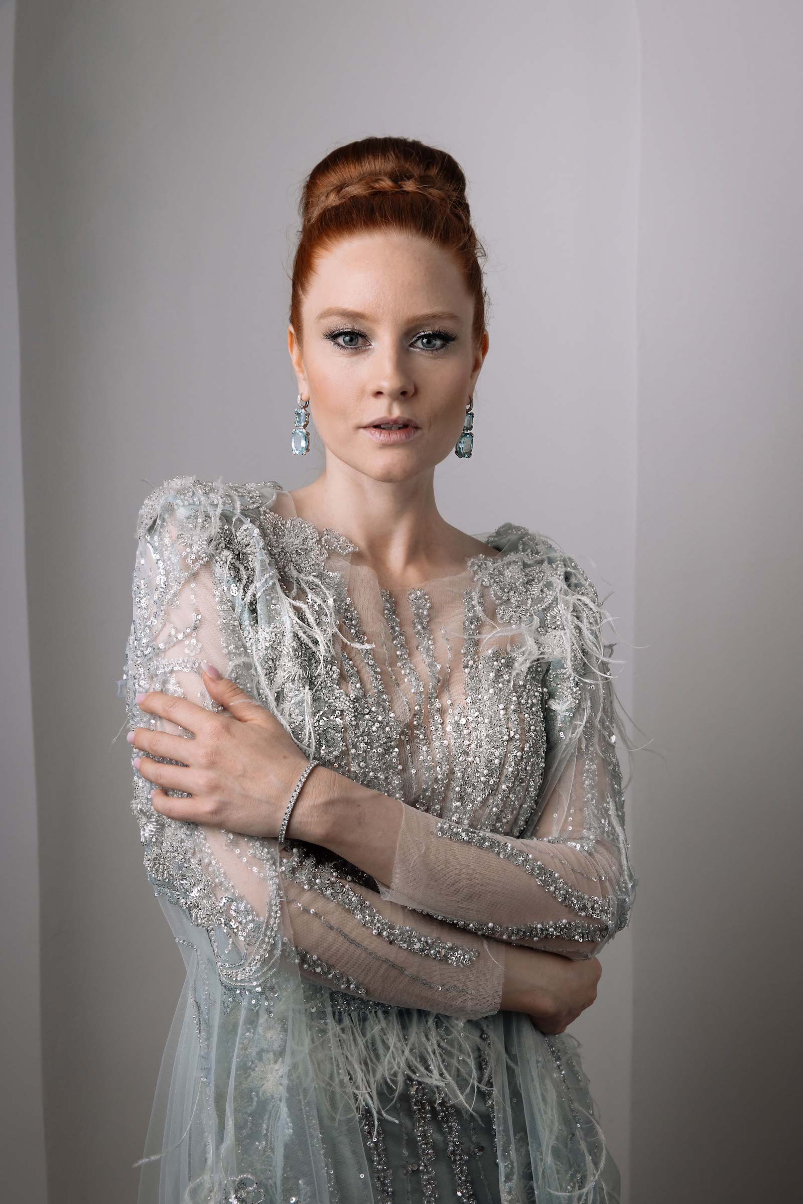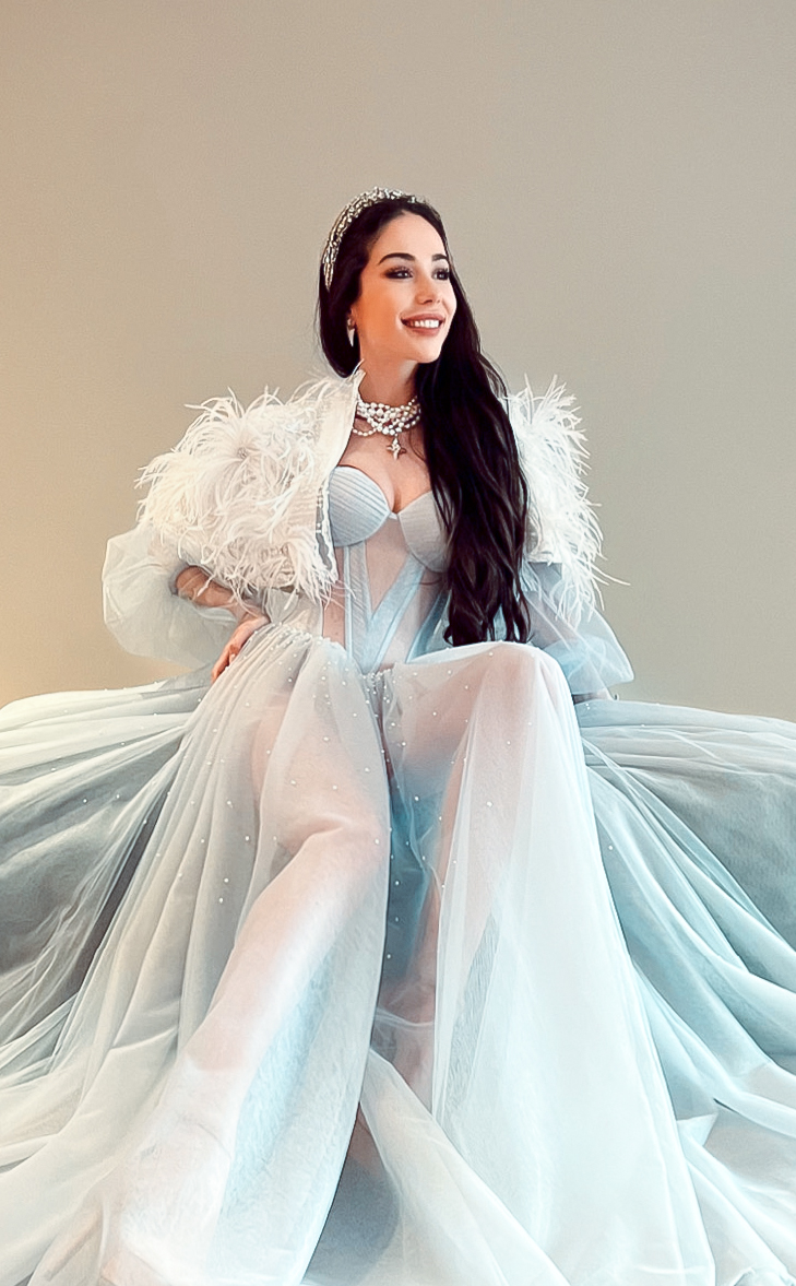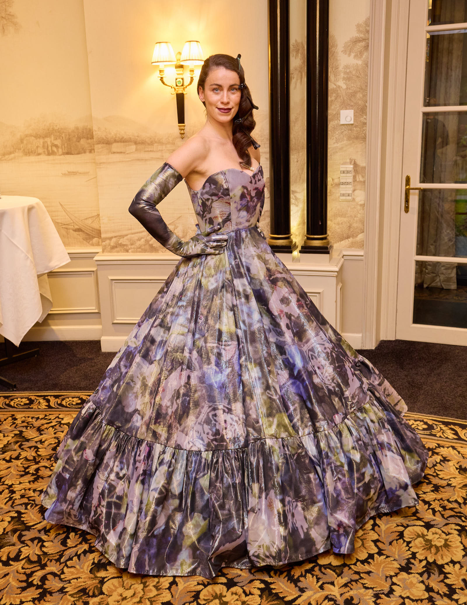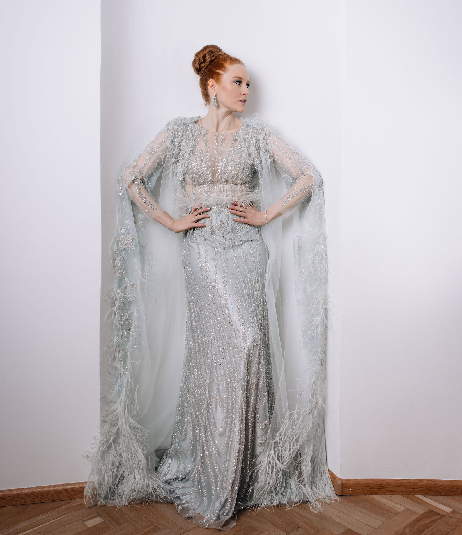 Barbara Meier entschied sich ebenfalls für eine vierteilige Couturerobe von Eva Poleschinski. Das Kleid in zarten Pastellmint- und Grautönen besteht aus Body, fließendem Rock sowie einem Gürtel und wird von einem zauberhaften Cape, das elegant über die Schultern fällt, abgerundet. „Mir gefällt das Florale an dem Kleid, und ich freue mich schon sehr darauf, es tragen zu dürfen“, so Meier.