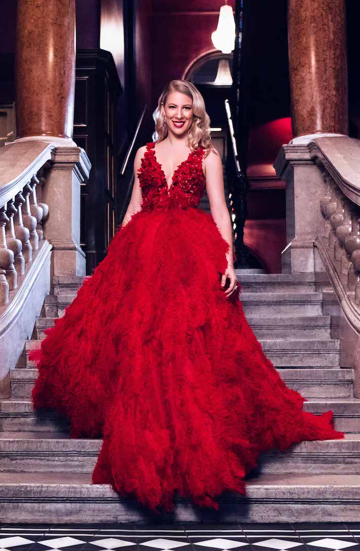 Einzugs-Choreographin Maria Santner entschied sich für eine Robe der österreichischen Designerin Eva Poleschinski. Die Robe besteht aus drei Teilen: einem Body mit handgefertigten 3D-Blüten, dem „Signature Rock“ aus roten Straußen-Federn und einem handbestickten Gürtel. Maria Santner: „Eva kreiert außergewöhnliche Design-Stücke, die auf meine individuellen Bedürfnisse während einem fordernden Ballabend, perfekt abgestimmt sind.“