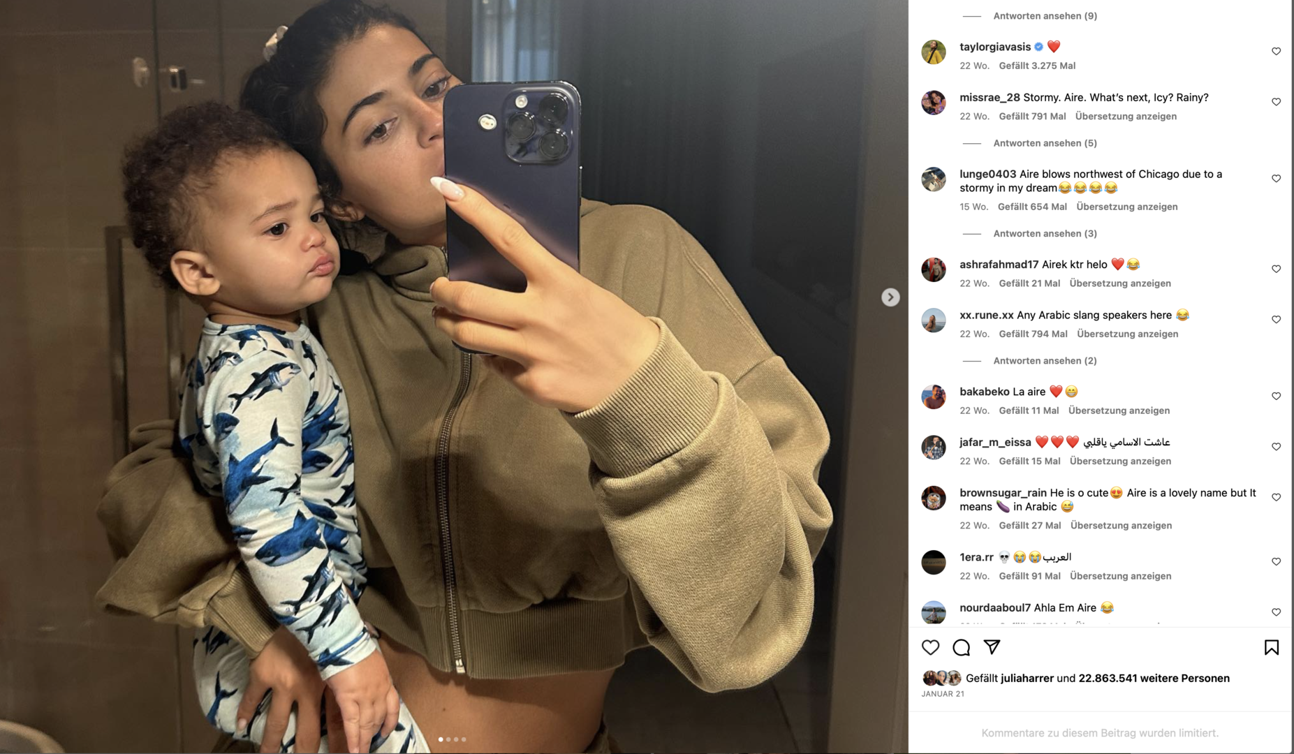 Der Bedeutung des Namens "Aire" – ausgesprochen wie das englische Wort "Air" für Luft – in anderen Nationen hat Jenner bei der Namensänderung aber wohl nicht bedacht. Einige ihrer Follower weisen sie darauf hin, dass "Aire" in arabischen Ländern nichts anderes als "Penis" heißt.