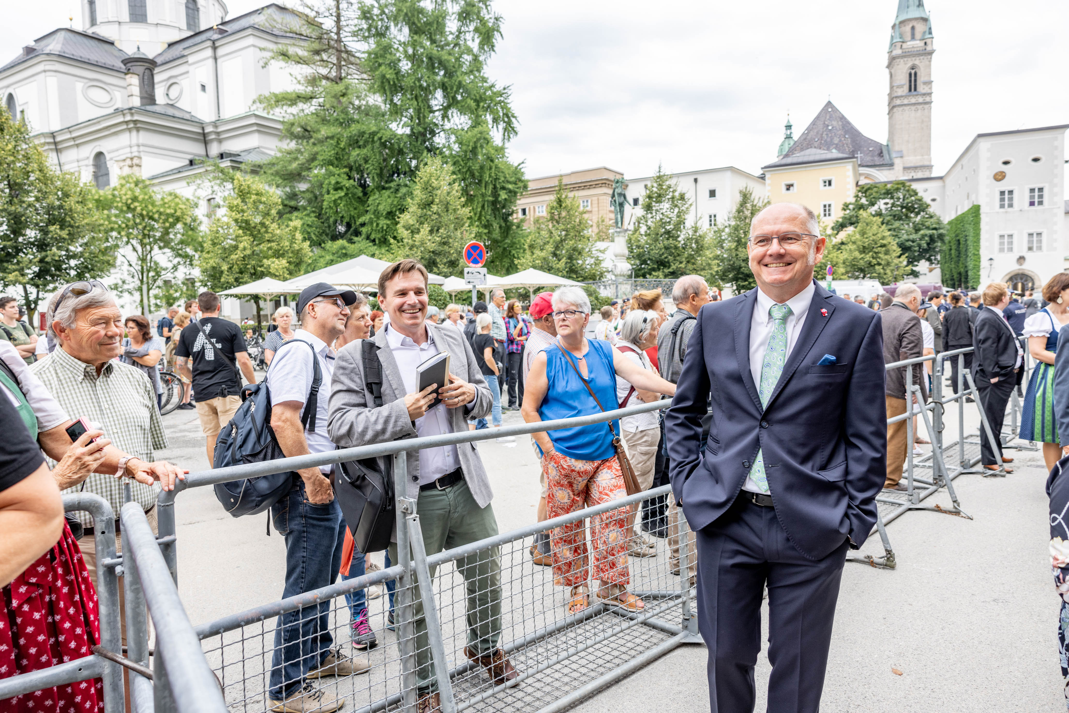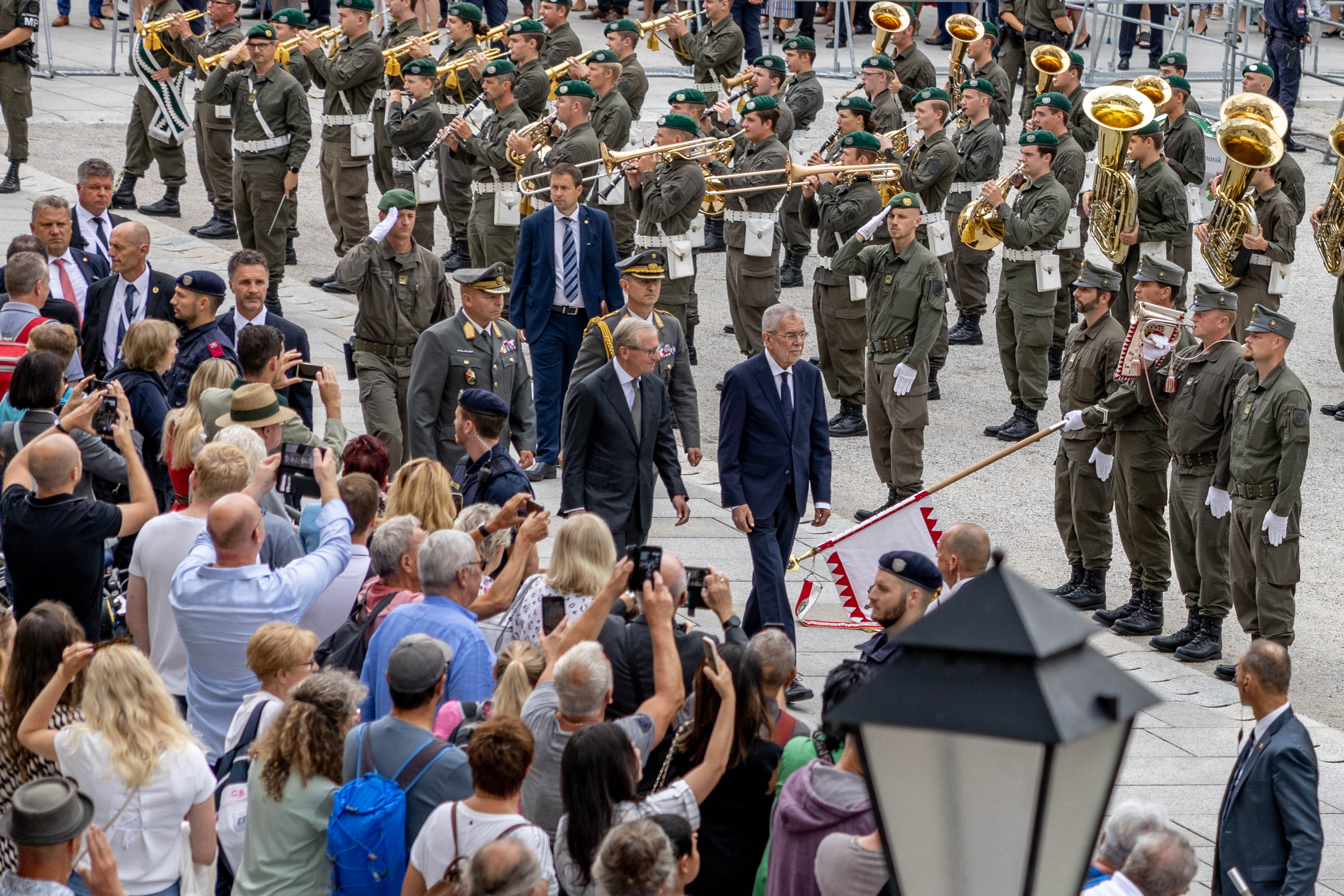 Salzburg ohne seine weltberühmten Festspiele? Das geht auch in Krisenzeiten nicht. Das mehrwöchige Spektakel wurde heute Vormittag mit hochkarätigen Polit-, Society- und Schauspielstars eröffnet. Zum Auftakt wurde Bundespräsident Alexander Van der Bellen von der Militärmusik mit Trompeten und Trommelwirbel begrüßt, im Anschluss marschierte die Hautevolee Richtung Felsenreitschule zum großen Festakt. Dort begrüßte erstmals die neue Festspielpräsidentin Kristina Hammer die Gäste.