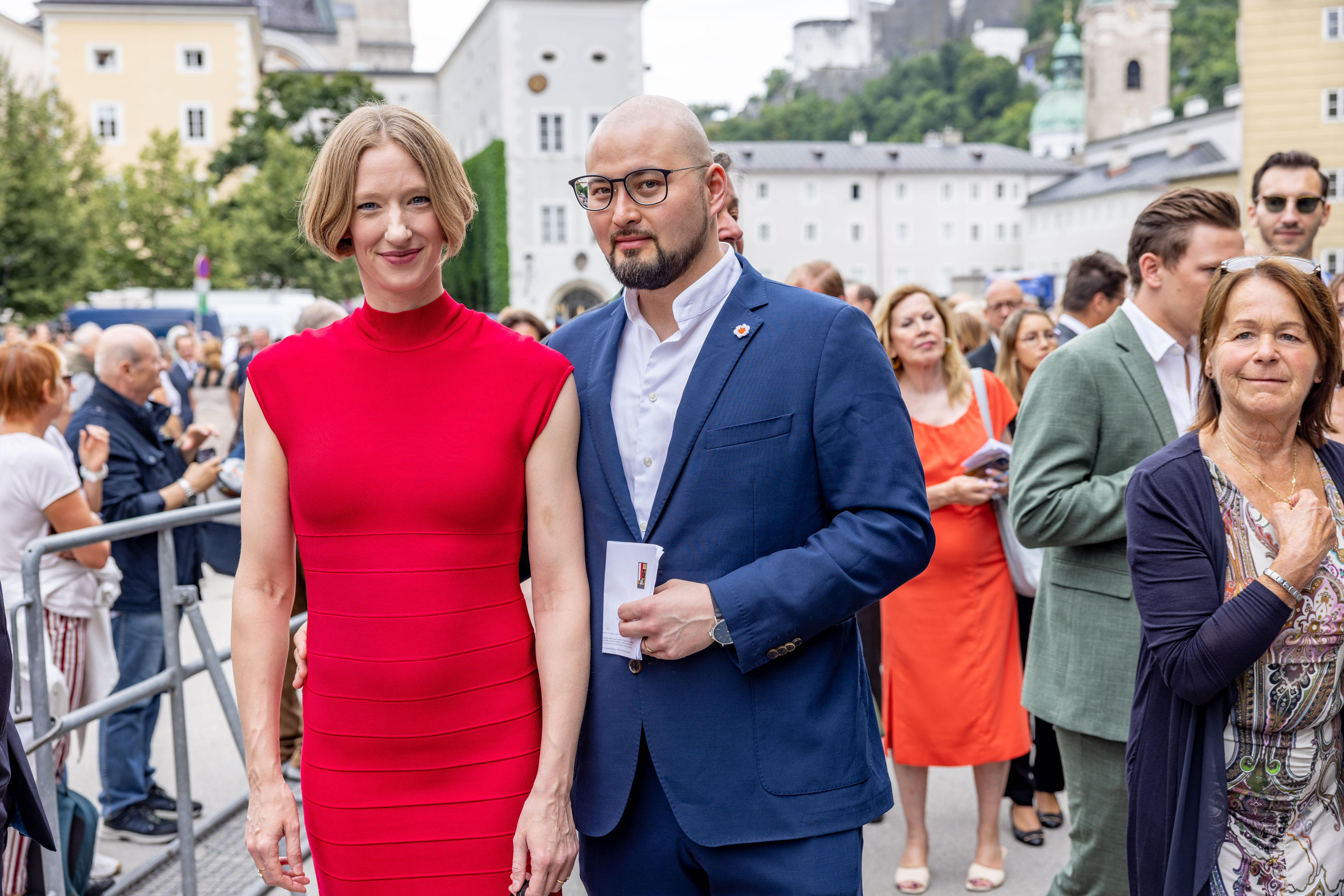 Gewohnt cool und trendy präsentierten sich die Jedermann-Hauptdarsteller. Zur Premiere marschierte Lars Eidinger (Jedermann) mit Kleid über den roten Teppich, bei der offiziellen Festspiel-Eröffnung stand er mit kurzen, knackigen Anzug-Shorts und ohne Hemd im Rampenlicht. Verena Altenberger setzte gekonnt auf eine elegant-legere Kombination in Weiß – ohne aufwendigen Schmuck.