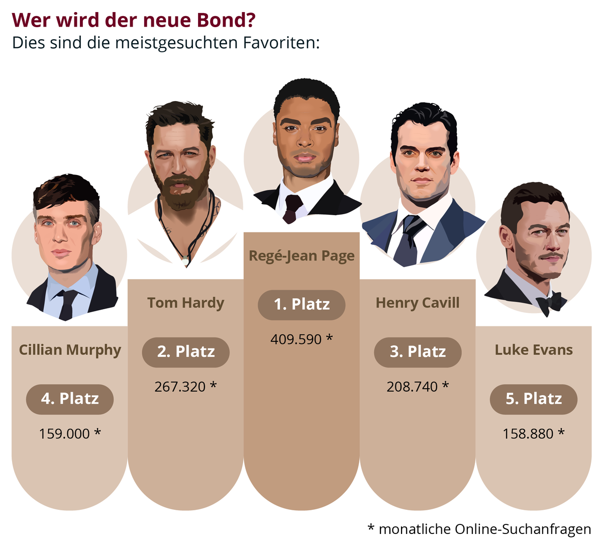 Mit 267.320 monatlichen Suchanfragen liegt Tom Hardy auf dem zweiten Platz. Bekannt aus Filmen wie "Mad Max" oder "Inception" ist der 44-Jährige jedenfalls bestens mit Action-Filmen vetraut. Auch "Witcher" Henry Cavill (208.740 Suchanfragen) und "Peaky Blinders"-Star Cillian Murphy (159.000 Suchanfragen) stehen hoch im Kurs. Wer das Rennen dann im Endeffekt macht, wird sich erst entscheiden. Und wer weiß, vielleicht hat Craig selbst ja auch einen Favoriten.
