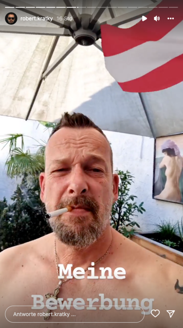 Robert Kratky nimmt die aktuelle Situation in der österreichischen Innenpolitik zum Anlass, seinen eigenen Hut in den Ring zu werfen. „Ich möchte mich an dieser Stelle als Minister für Digitalisierung, Wirtschaft und Landwirtschaft bewerben", erklärt der Moderator oberkörperfrei auf Instagram. „Auch wenn ich kein Leiberl bei der Wahl hätte – ich stehe nicht ohne Hosen da“, fügt er hinzu.