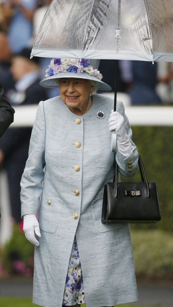 Am zweiten Tag des Pferderennens in Ascot präsentiert sich die Queen trotz Regen mit einem Lächeln im Gesicht. Passend zu den Wetterverhältnissen trägt sie ein…