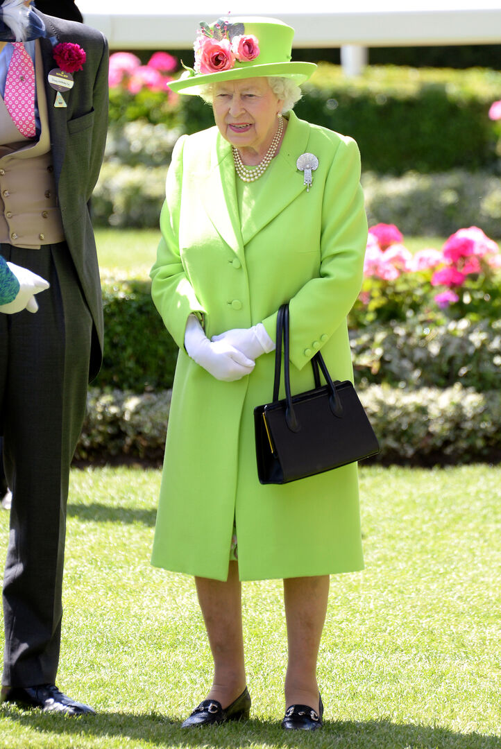 Auch die Royals tragen Neon. Queen Elizabeth liegt voll im Trend mit ihrem Neongrünen Mantekleid. Die Tasche bleibt klassisch Schwarz.