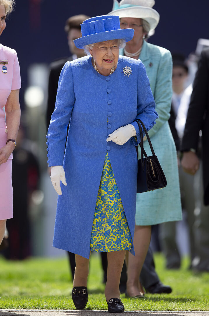 Beim Pferderennen in Epsom zeigt sich die Queen gut gelaunt in einer sommerlichen Kreationen in Blau- und Gelbtönen. Unter dem klassisch bestickten Mantel…