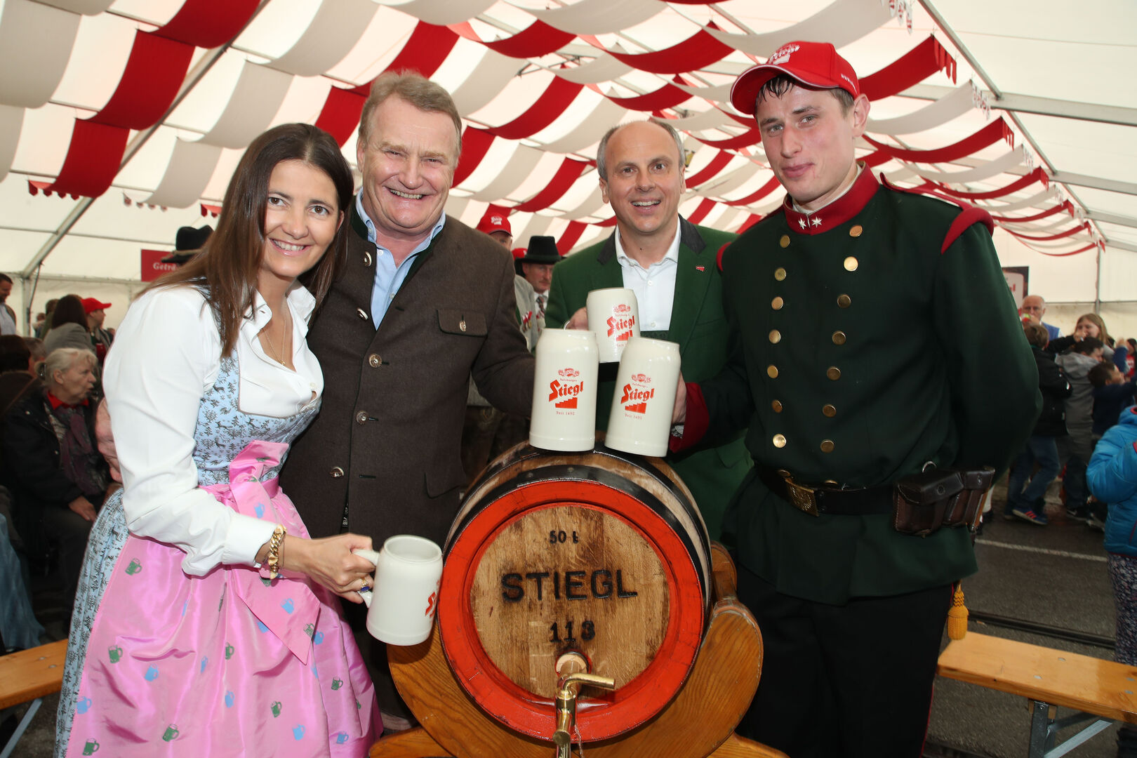 Die Stiegl-Eigentümer Alessandra und Heinrich Dieter Kiener mit Braumeister Christian Pöpperl und „Fass-Bezwinger“ Günther Fuschlberger (v. li.).