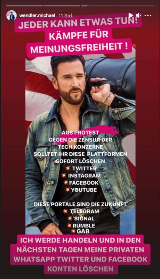 In seinem jüngsten Posting verkündet der Wendler nun, seine persönlichen Twitter-, Facebook- und Whats App-Accounts in den nächsten Tagen zu löschen und damit gegen die „Zensur der Tech Unternehmen" vorzugehen. Auf die Meinungen des Sängers muss man aber auch in Zukunft nicht verzichten, denn in Foren wie Telegram, Signal, Rumble und Gab wird er auch weiterhin aktiv sein.