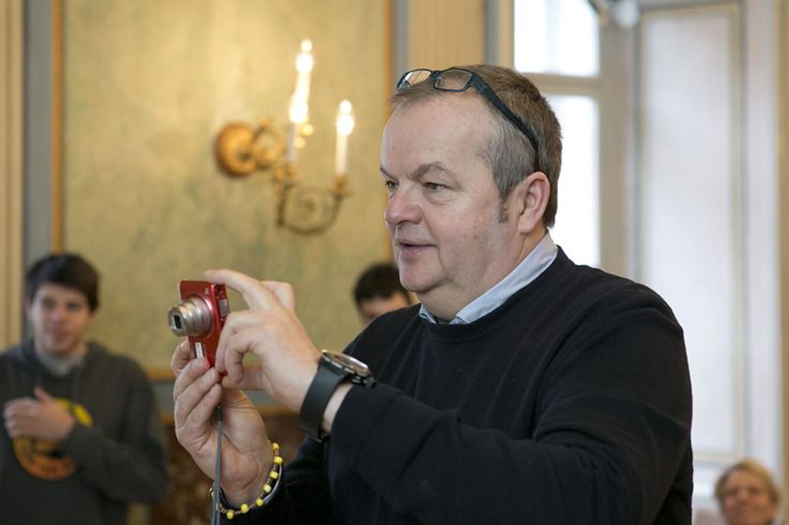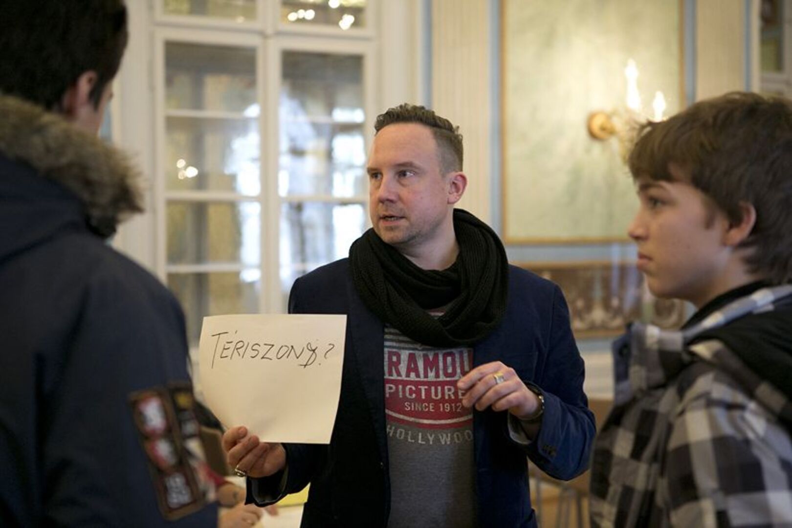 Hendrik Müller und ungarische Statisten bei der Frage "Höhenangst?"