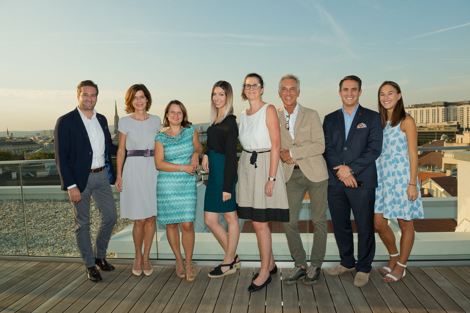 Die Makler beim Networken auf der Dachterrasse einer der Ambassador Wohnungen (190 m²), die bereits verkauft wurde: Valentin Winkler (Marlies Muhr), Elisabeth…